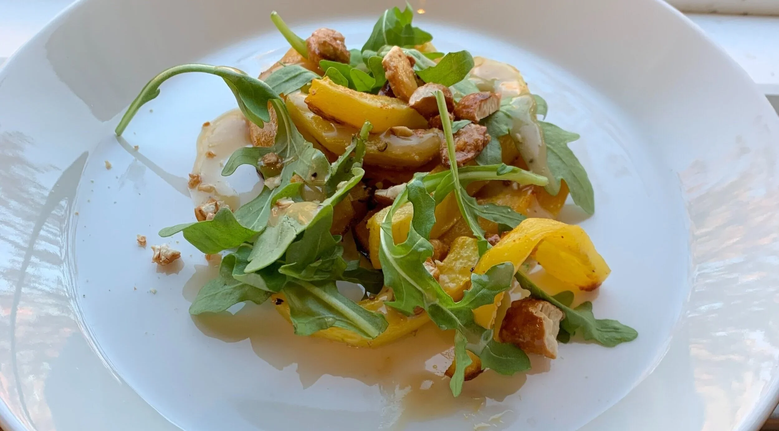 A fresh and flavorful Arugula and Roasted Squash Salad with Maple Dijon Dressing, packed with seasonal fall ingredients.