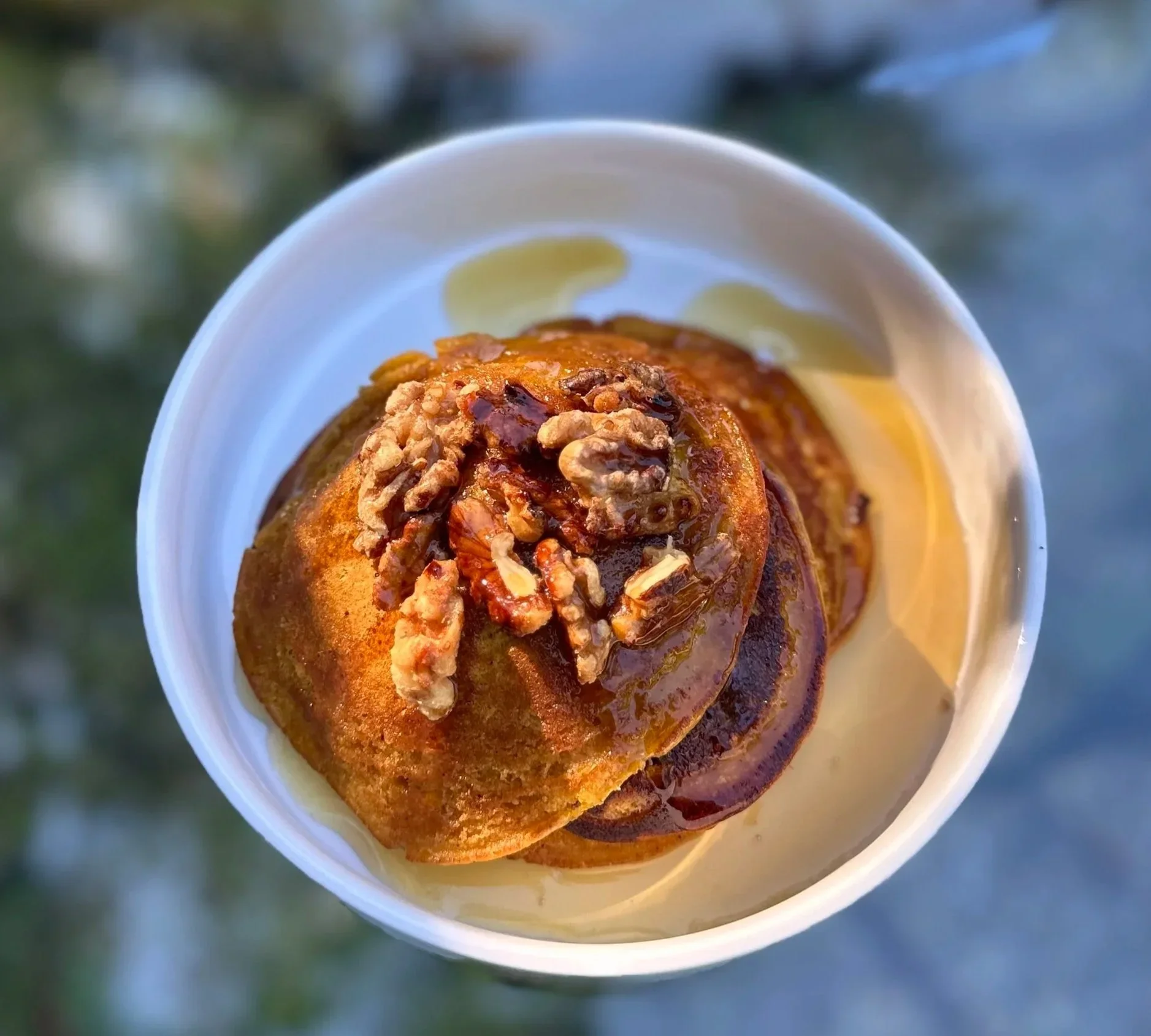 Pumpkin Pancakes with Maple Roasted Walnuts