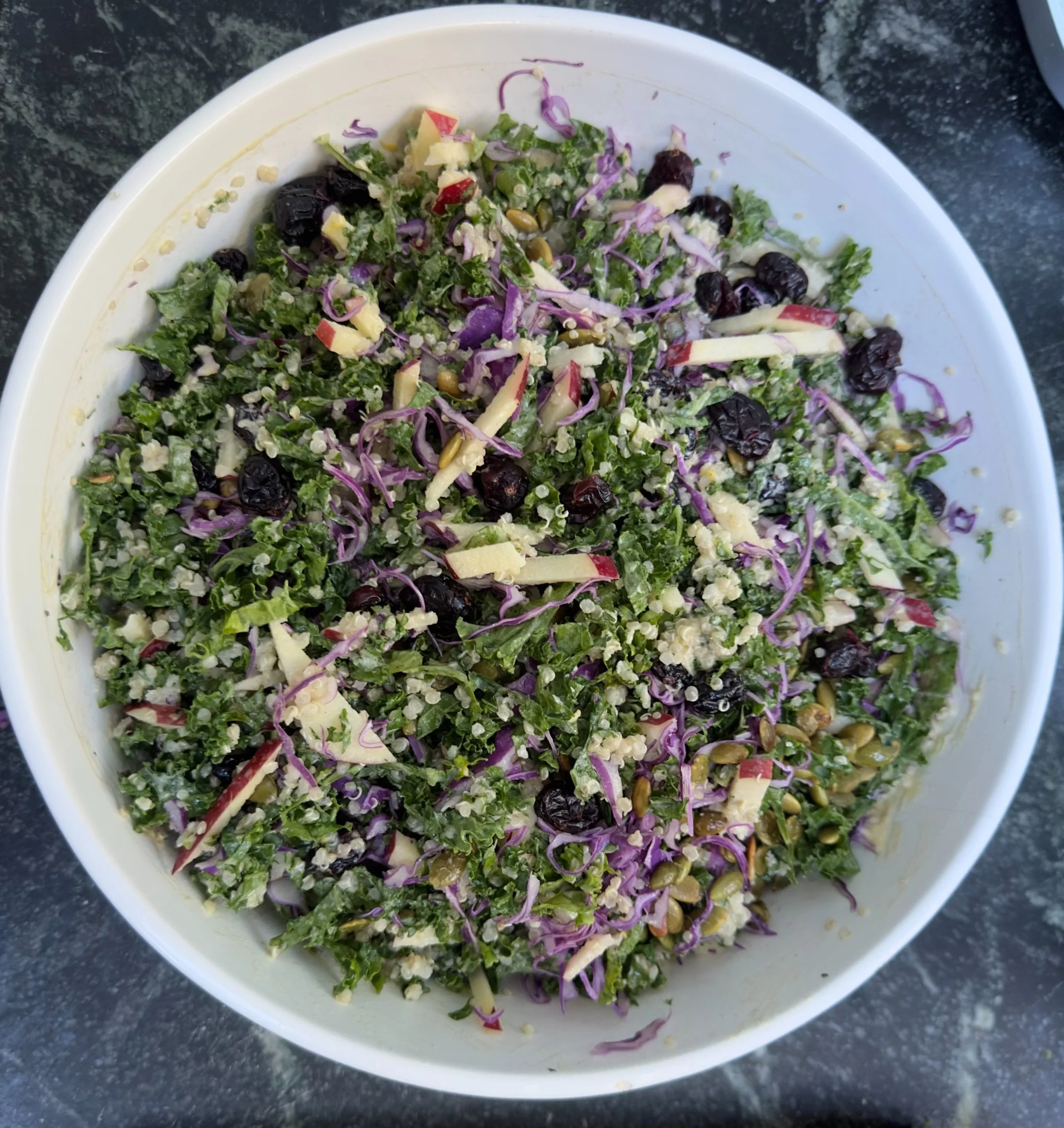 Nutrient-packed Kale Harvest Salad with quinoa, pumpkin seeds, apples, and a creamy tahini dressing for a flavorful vegan meal.