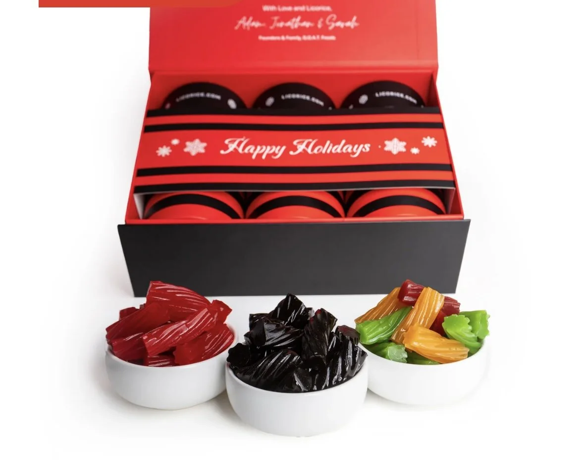 Give a holiday host gift that feels truly special with this Australian Licorice Assortment Gift Box. Featuring three Australian-style licorice flavors—Australian Red, Australian Black, and Australian Mix—this curated selection delivers soft, chewy perfection in every bite. Each piece is made with vegan-friendly ingredients and bold, festive flavors, creating a gift that’s both thoughtful and delicious. It’s the perfect way to share a gourmet treat that everyone can enjoy this season.