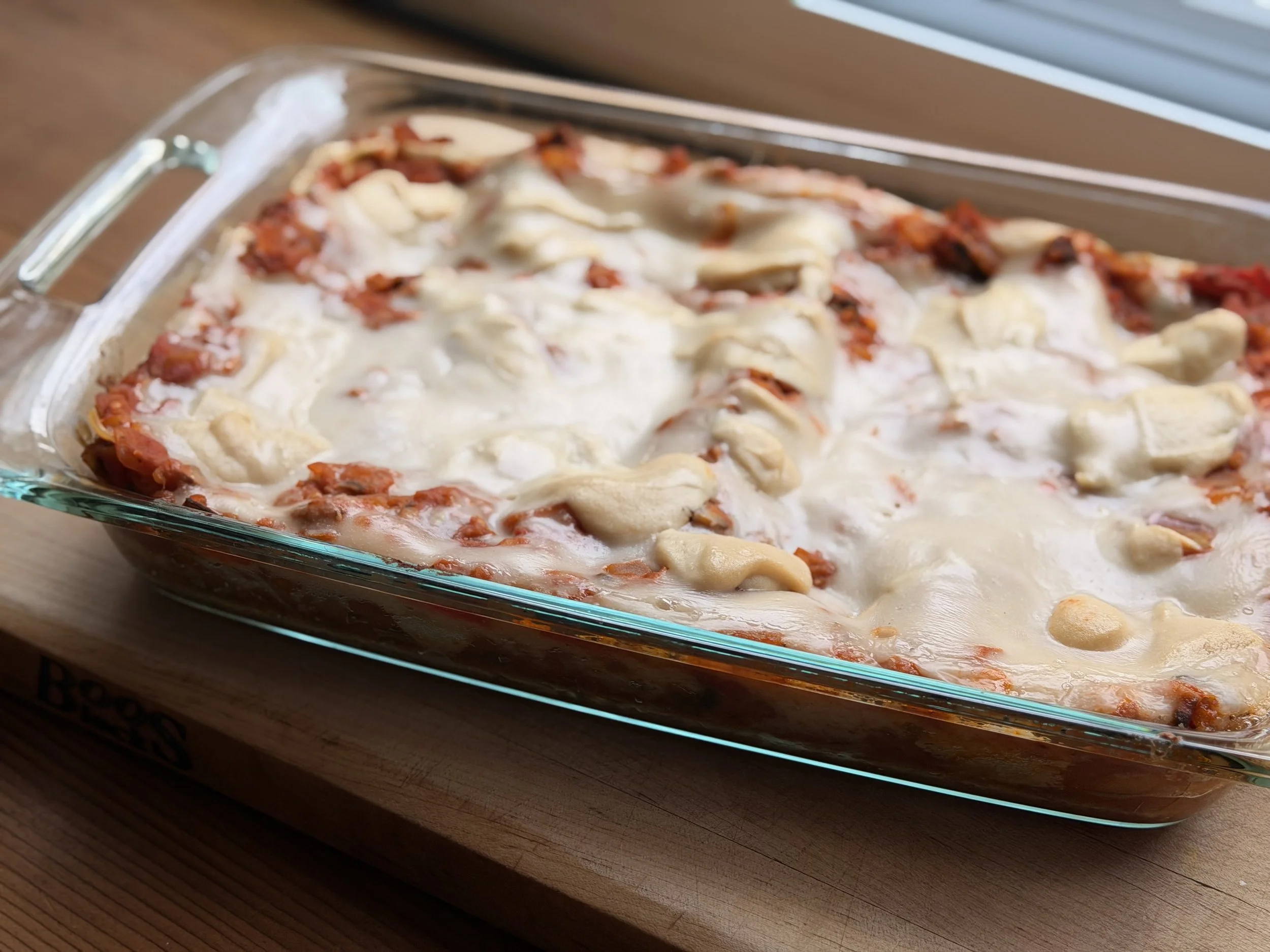 Spread a thin layer of ragù in the bottom of a baking dish. Add a layer of noodles, then ragù, dollops of cashew ricotta, spinach, and a sprinkle of vegan mozzarella.