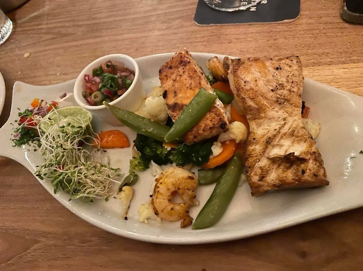 Si, See & Sea—Salmon, snapper and shrimp, pico de gallo sauce served with potato wedge