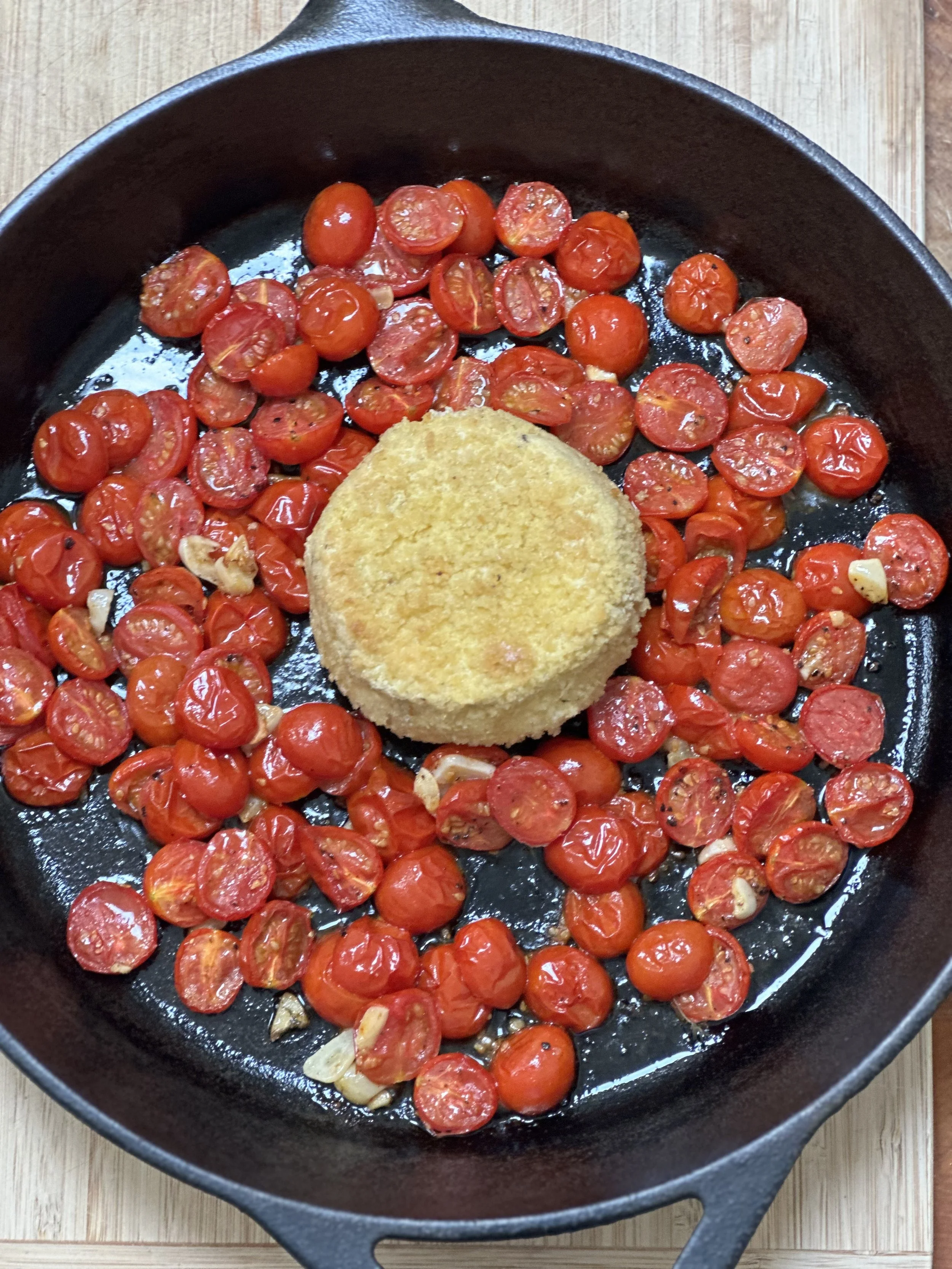In a cast iron skillet, add a tablespoon of olive oil and heat. Sear each side of the Boursin for about 30 seconds to get the right color and texture.