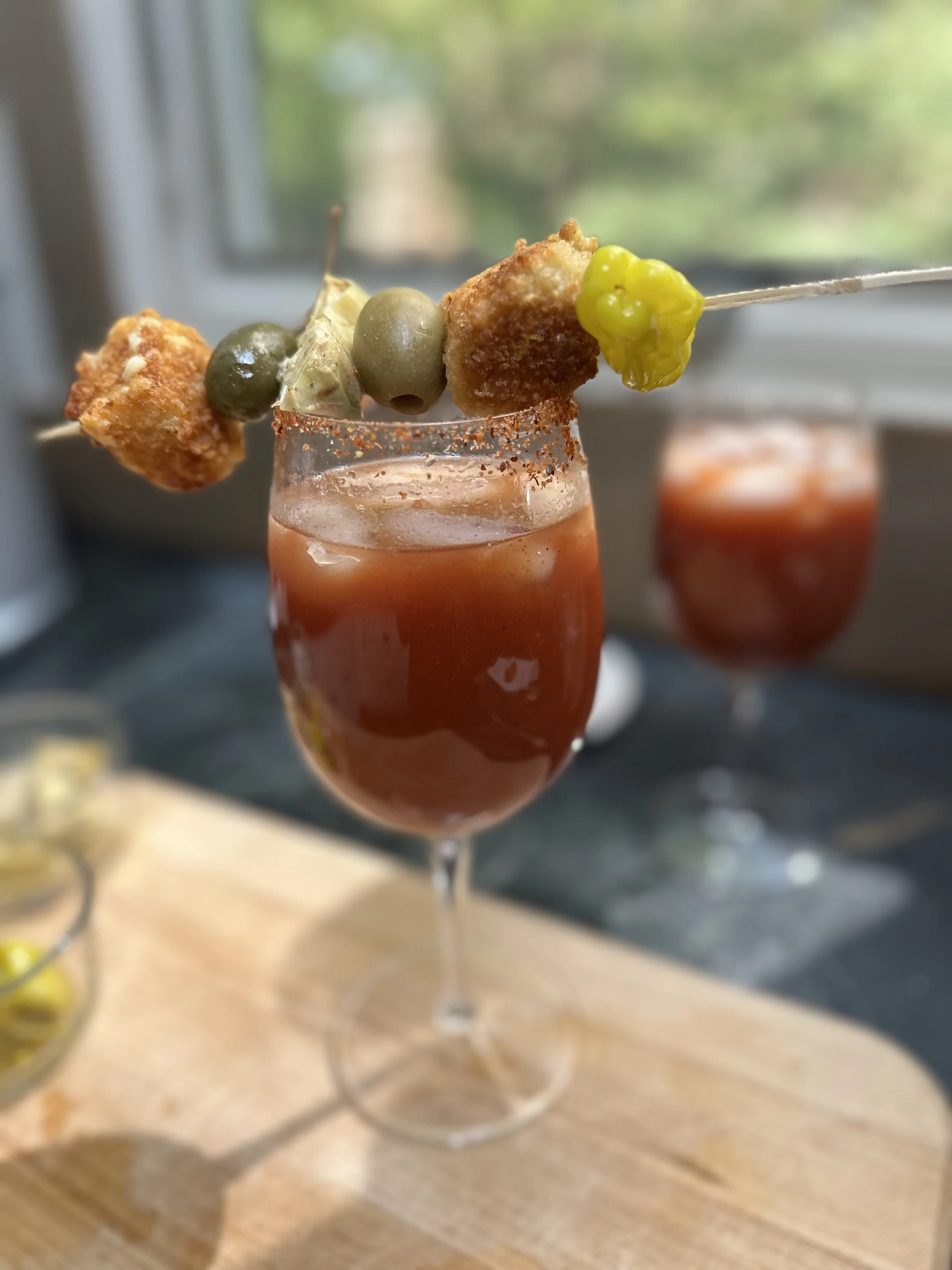 The Ultimate Bloody Maria Skewer, this is a show-stopping garnish that takes your cocktail game to new heights. Featuring crispy panko-fried Vermont cheddar cheese cubes, the richness of the cheese is perfectly balanced by tangy caper berries, briny garlic-stuffed olives, zesty peperoncini, and marinated artichoke hearts. This vibrant skewer isn’t just a garnish—it’s an appetizer in itself, designed to elevate the bold flavors of your Bloody Maria and add a touch of indulgence to your brunch or at home happy hour. We like to think of this as grilled cheese and tomato soup for grown ups.