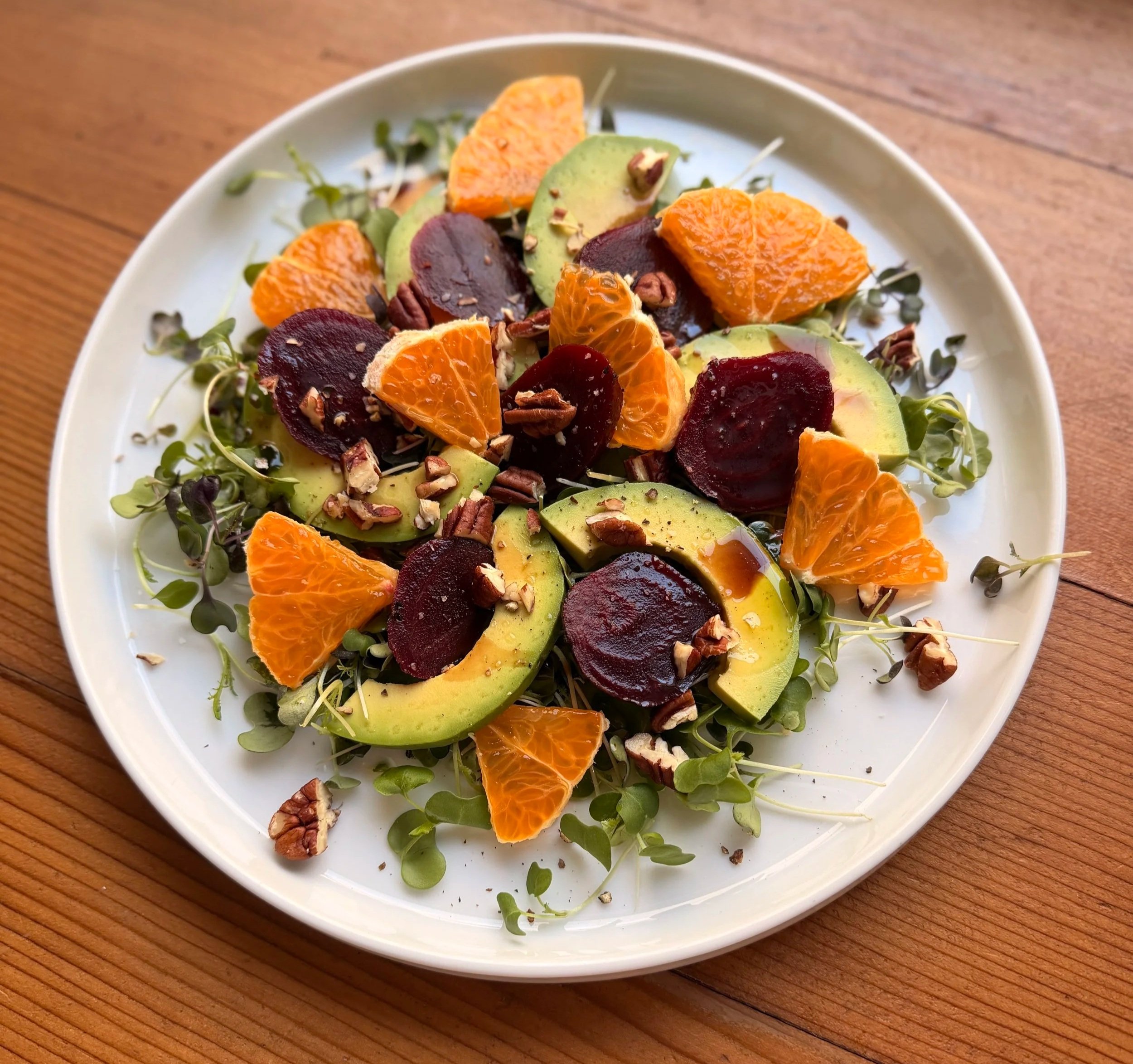 This is the kind of dish that works year-round but feels especially perfect in the transitional seasons — when you crave something fresh yet substantial. The earthy sweetness of cooked beets pairs naturally with juicy orange segments, while avocado adds richness and balance. A sprinkle of pecans brings a satisfying crunch, and a simple drizzle of olive oil and balsamic vinegar ties everything together without overpowering the ingredients.
