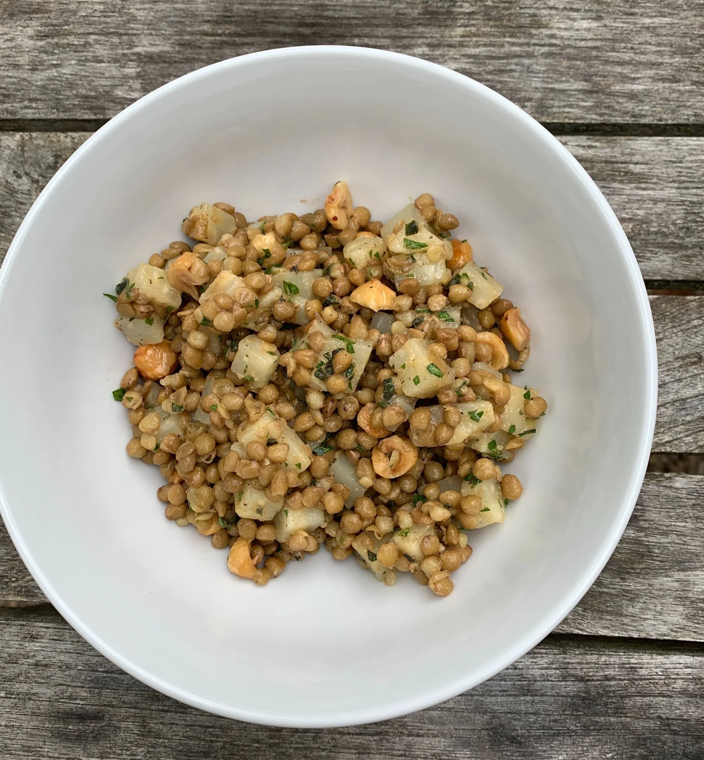 After the lentils and celeriac have cooled, add parsley, mint, and hazelnuts.