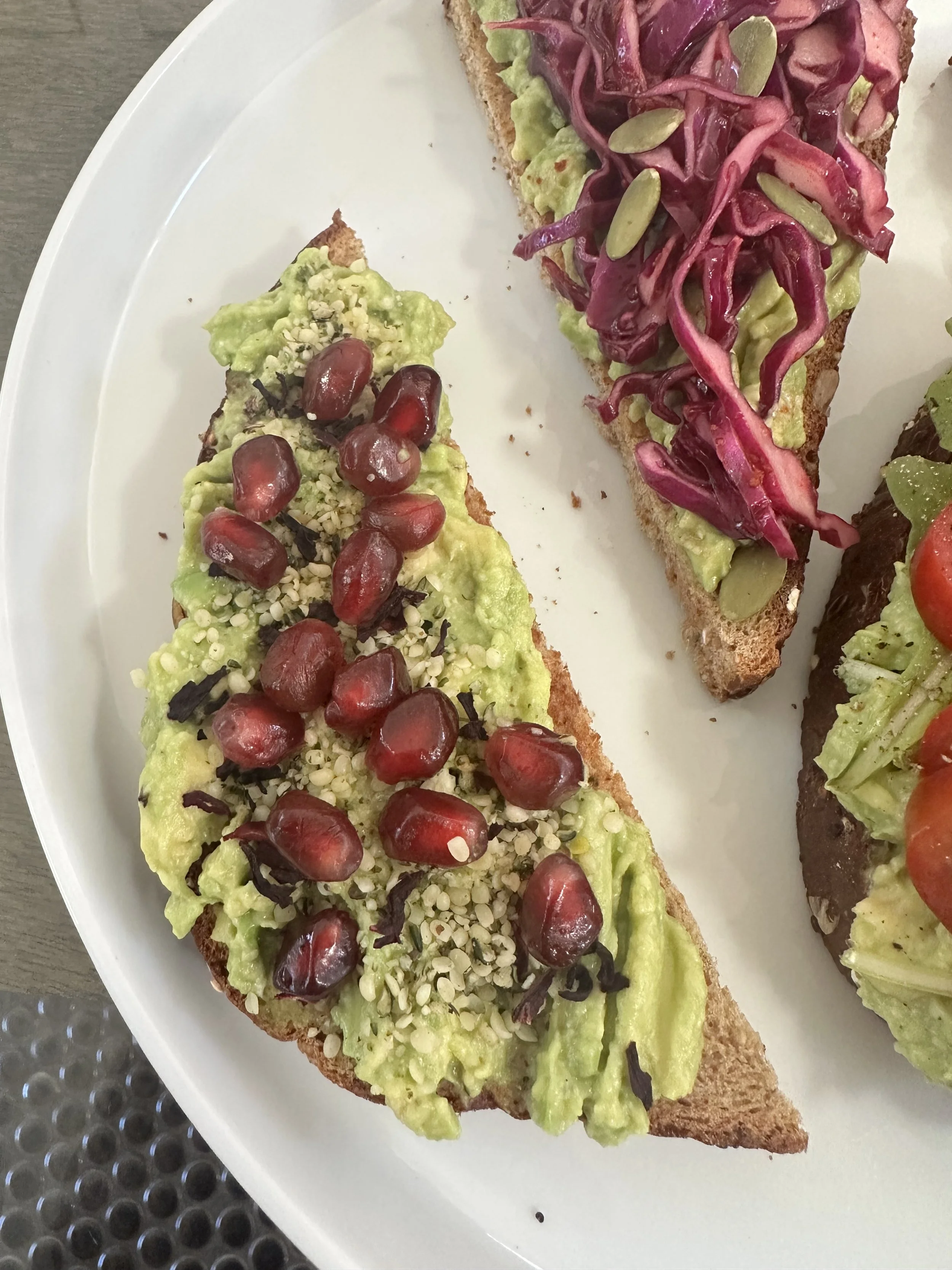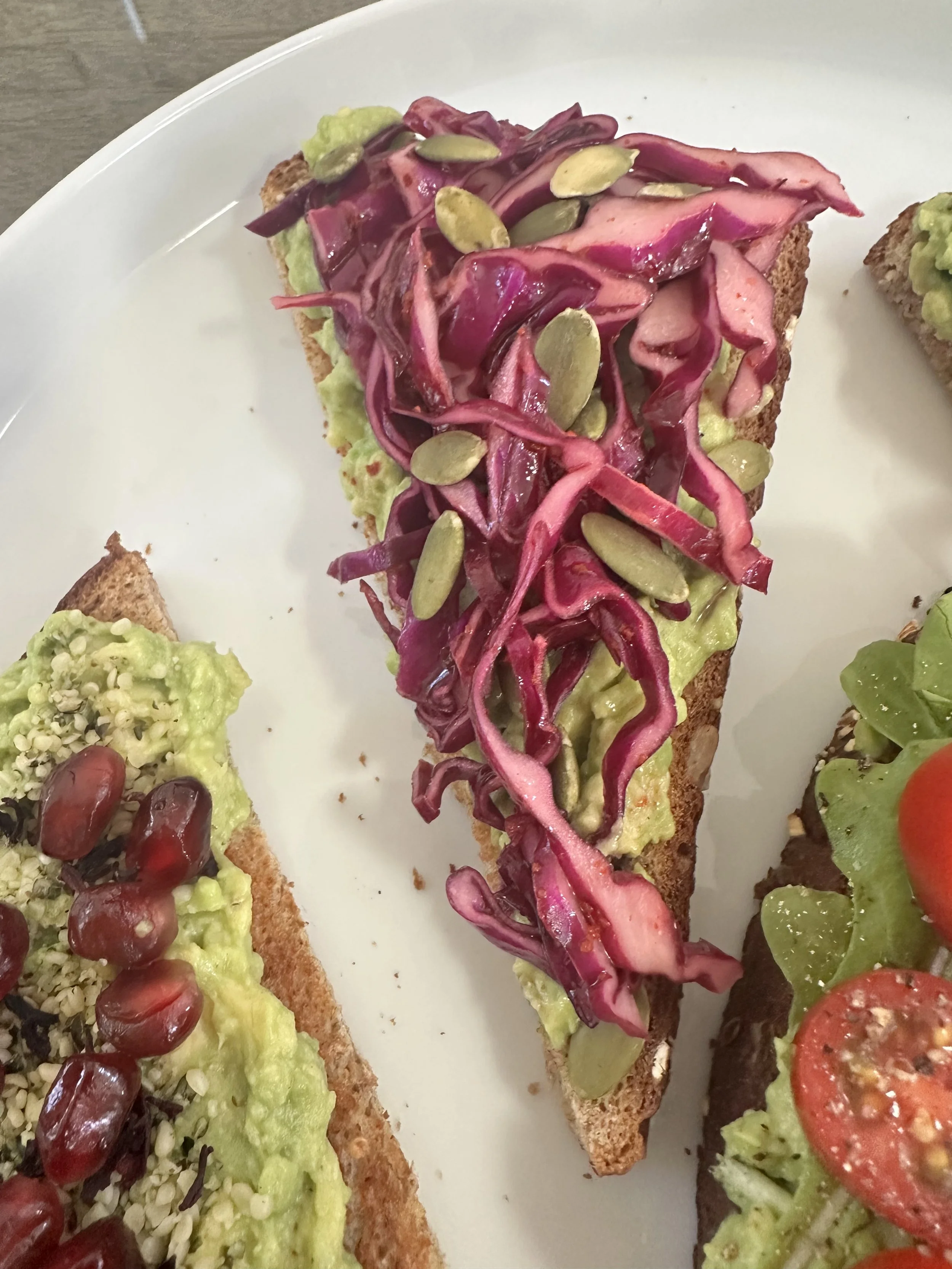 The Crunchy: Avocado smash + pumpkin seeds + spicy red cabbage + chia seeds.