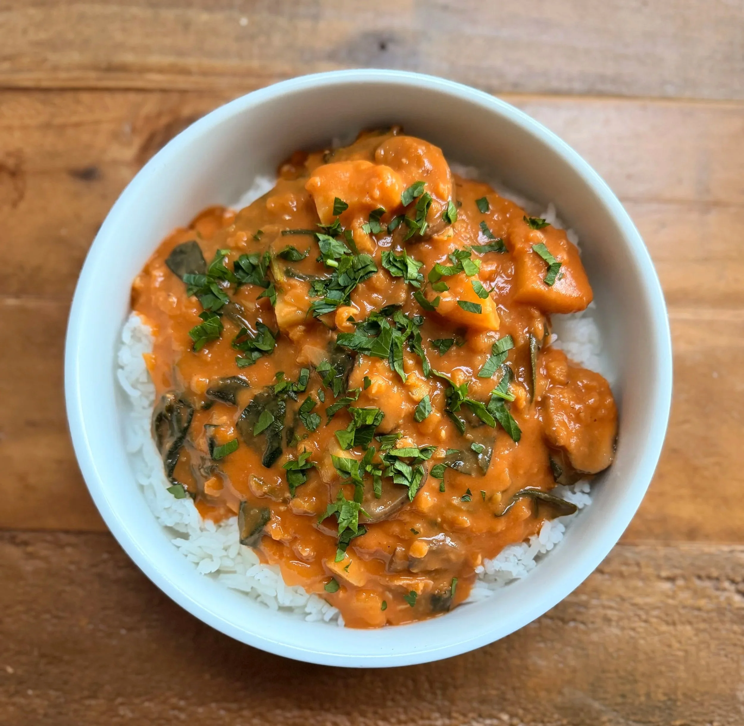 This nourishing plant-based dish is deeply savory, gently sweet, and brightened with fresh lemon. Yellow lentils simmered in vegetable broth form the creamy base, while sautéed mushrooms, onions, parsnips, garlic, and ginger add layers of earthy flavor. Coconut milk and tomato paste bring richness and depth, while soy sauce and maple syrup balance the dish with umami and subtle sweetness. Fresh spinach wilts into the stew at the end, creating a vibrant, satisfying meal perfect for a cozy dinner.Ingredients (Serves 2–3)