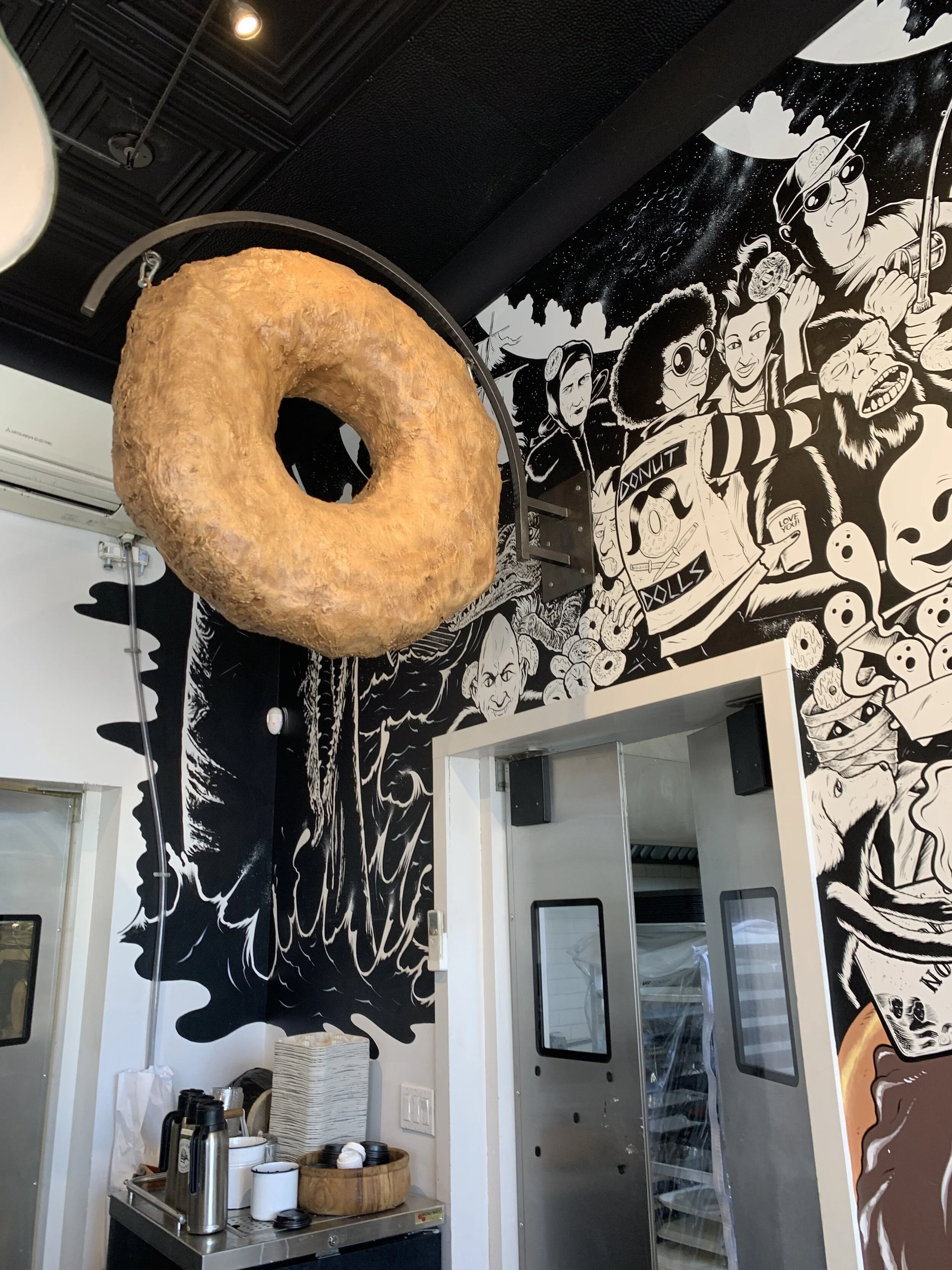I ordered a regular drip coffee it was really good. Grindstone advertises using Ace Coffee and Stumptown so I’m not sure which I had but it was solid. Lynette had a cold brew with a splash of oat milk and it really was something else. Delicious. To eat we tried the churro donut, Boston Cream, Lemon Poppyseed filled with strawberry jam, and an East Coast favorite the cider donut with carmel glaze. It took us a few days to get through eating all of them because they are sweet and stuffed but a fun and tasty treat.
