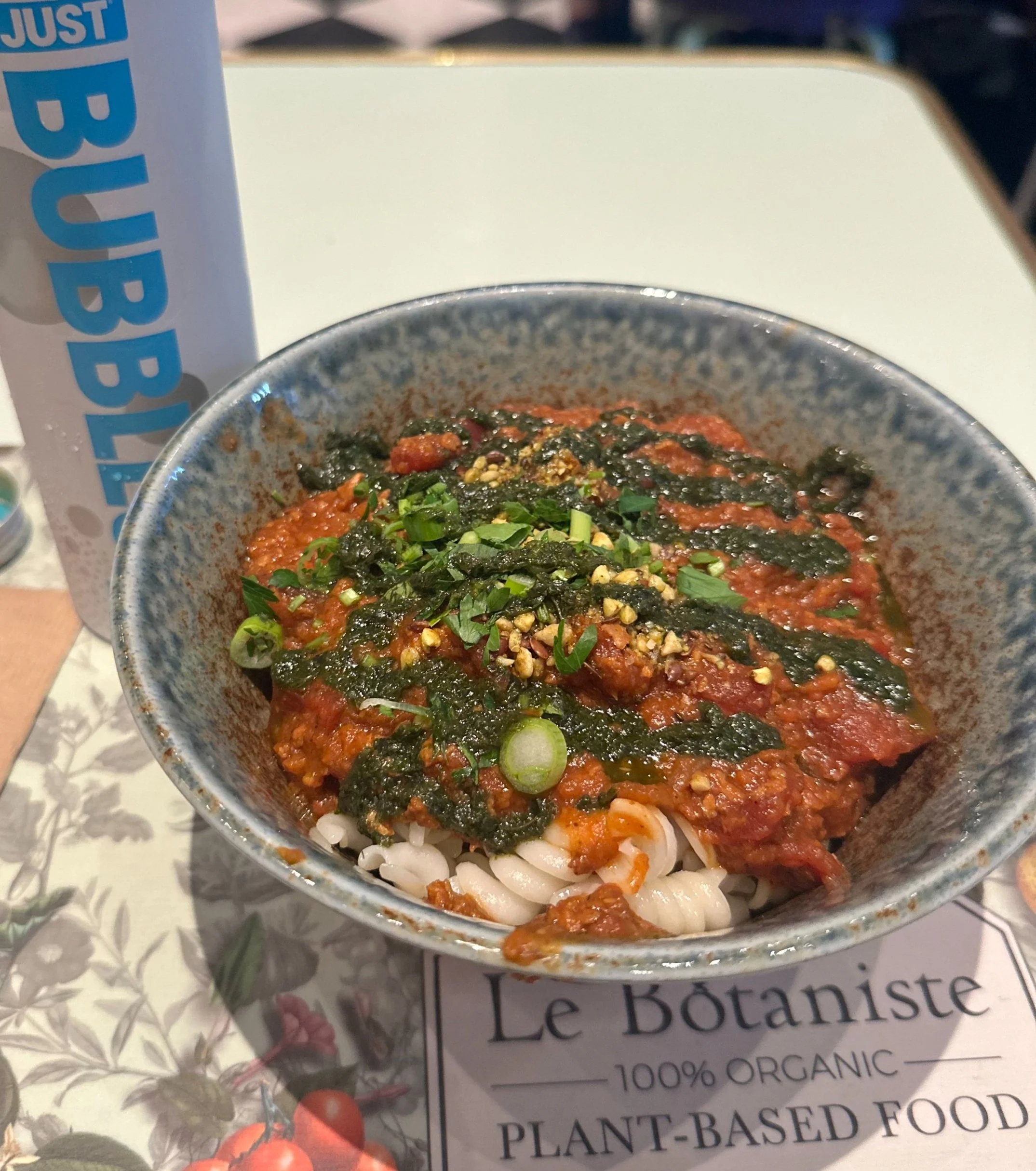The menu is rooted in globally inspired botanical bowls, brimming with hearty grains, house-made sauces, and fresh, organic vegetables. Signature dishes like the Tibetan Mama (a comforting coconut curry over brown rice) and the Pasta Bolo (a vegan twist on a classic Bolognese, photo below) showcase how deeply satisfying plant-based meals can be. Guests can also build their own bowl from a lineup of vibrant, seasonal ingredients.