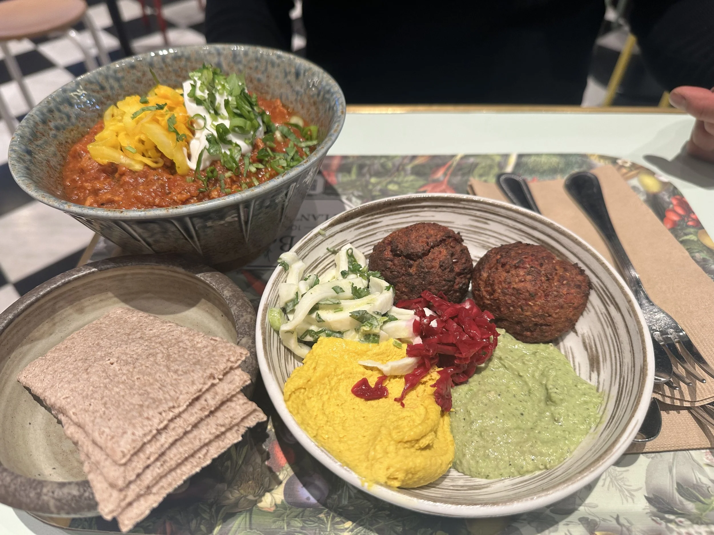 Le Botaniste’s Mezze Platter and Chili Sin Carne Bowl showcase the restaurant’s knack for turning simple, plant-based ingredients into deeply satisfying meals. The Mezze Platter is a vibrant mosaic of Mediterranean flavors—creamy hummus, tangy pickled vegetables, and warm grains, served with crisp crackers and a drizzle of herbed oil. It’s the perfect shareable starter or light lunch that feels equal parts nourishing and indulgent. Meanwhile, the Chili Sin Carne is their take on comfort food, slow-simmered with lentils, kidney beans, and aromatic spices, then finished with avocado and a dollop of vegan sour cream. Hearty, smoky, and deeply flavorful, it’s the kind of bowl that leaves you both full and energized.