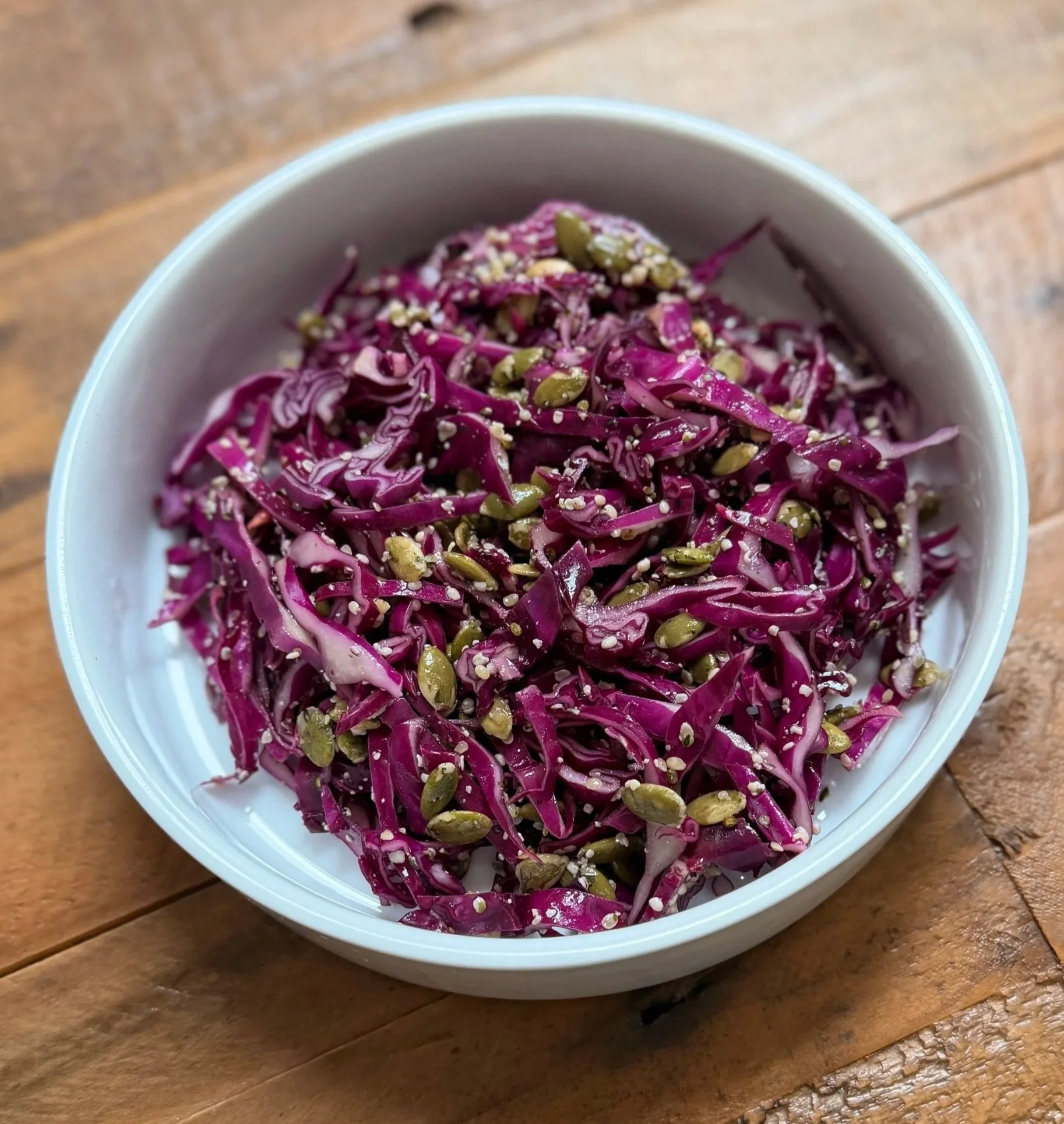 At the heart of this dish is finely shredded red cabbage, transformed through a quick massage with salt into a tender, flavorful base. From there, a light dressing of olive oil, fresh lemon juice, and garlic brings balance and brightness, enhancing the natural sweetness of the cabbage. The finishing touch is a generous sprinkle of roasted pumpkin seeds and hemp hearts, adding richness, crunch, and a subtle nutty depth.