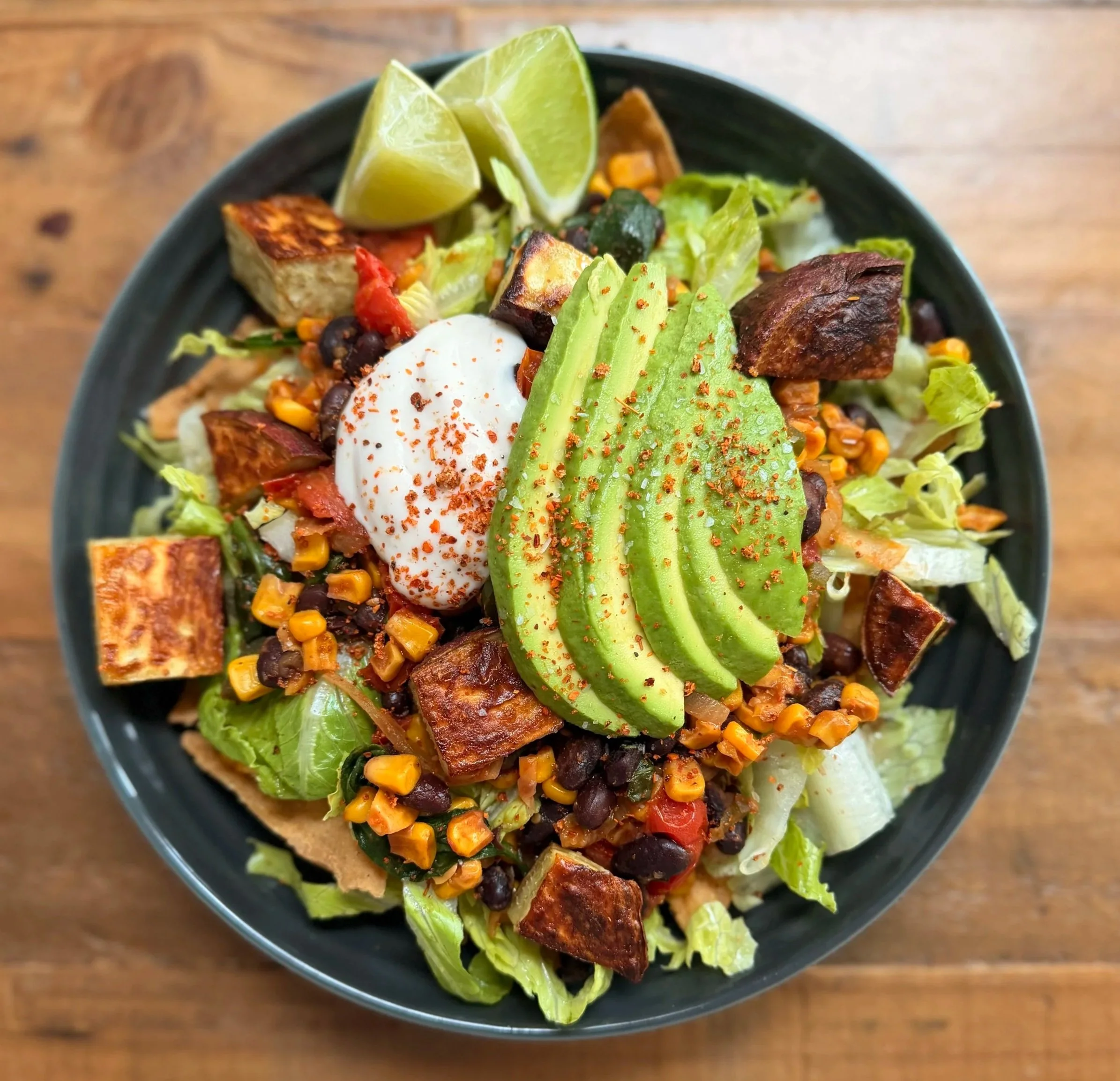 There are nights when you want something deeply comforting—but still fresh, colorful, and layered with real flavor. This Mexican-inspired Buddha bowl came together in exactly that spirit: a little indulgent, a little nourishing, and completely satisfying. It starts with a base of warm tortilla chips and melty vegan cheese (because joy matters), then builds into something brighter with crisp romaine, a smoky sauté of corn, black beans, and spices, and caramelized Japanese sweet potatoes for a subtle sweetness that ties everything together.
