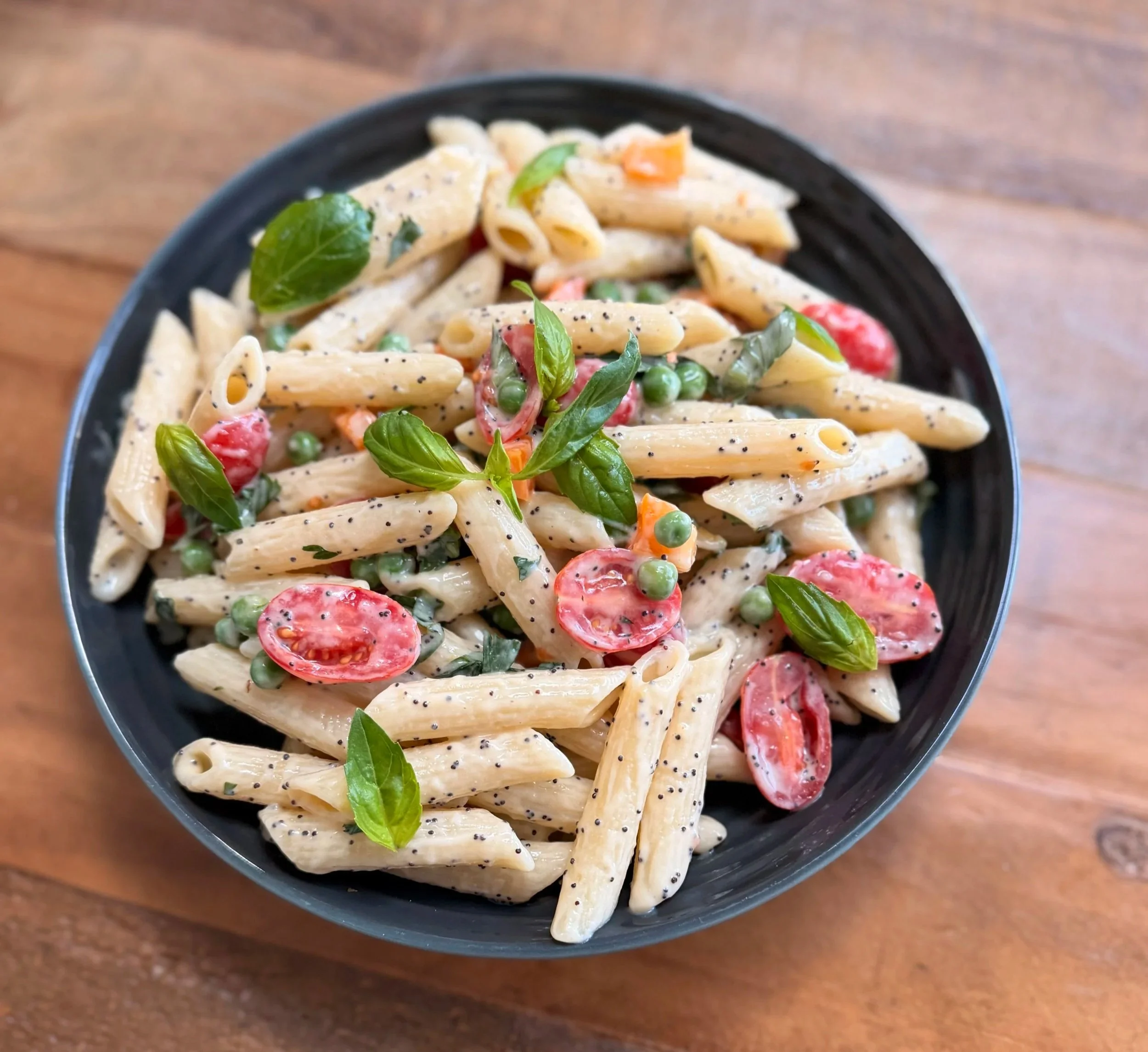 This vibrant spring and summer pasta salad is everything you want on your table for Memorial Day and beyond—fresh, colorful, and effortlessly delicious. Tender penne pasta is tossed with sweet peas, juicy cherry tomatoes, crisp peppers, and fragrant basil, then coated in a light and creamy lemon poppy seed dressing made with plant-based yogurt. It’s the perfect balance of bright citrus, subtle sweetness, and herbaceous flavor.