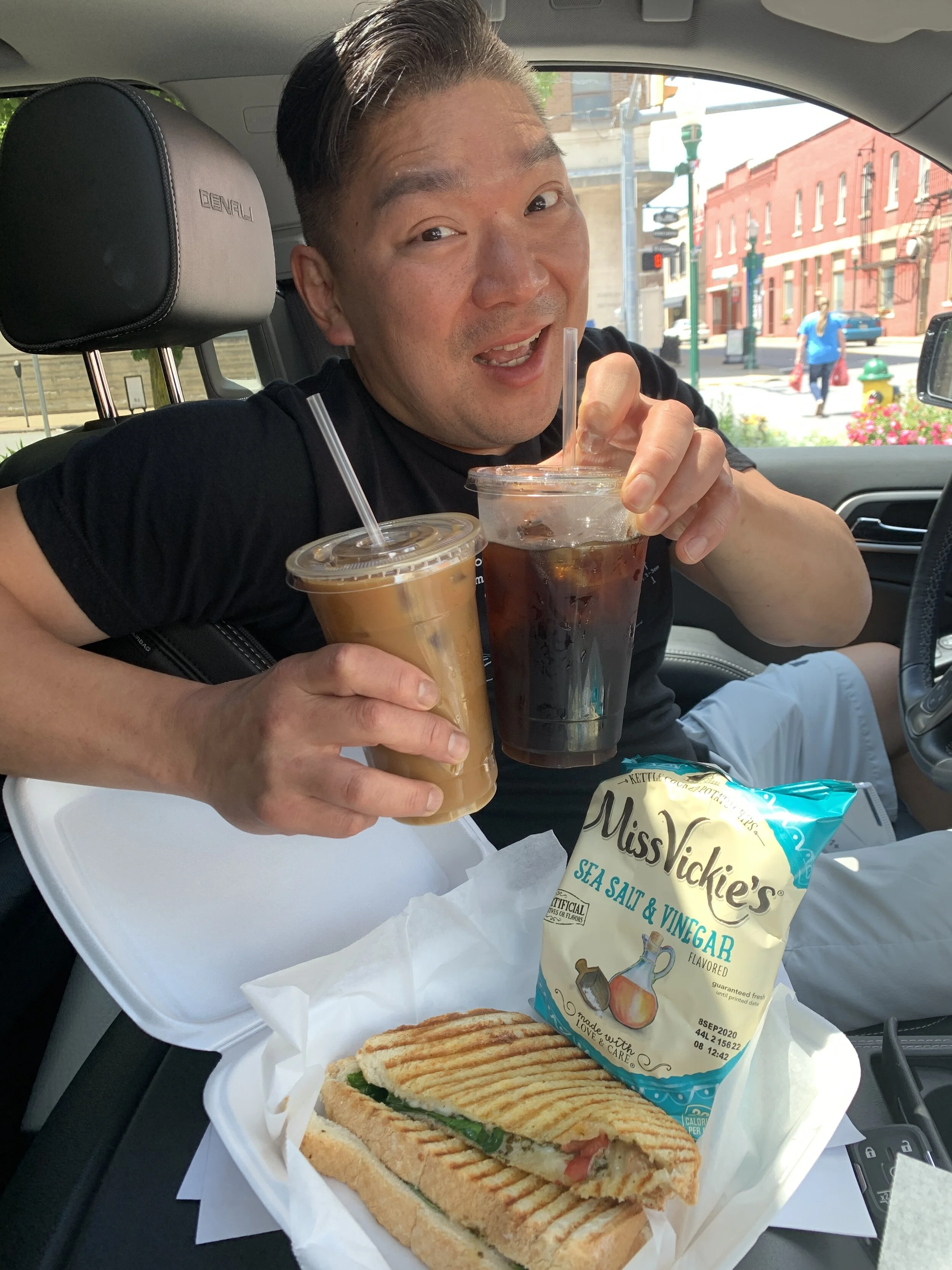 Aside from filling up for gasoline, our only stop was about 4 1/2 hours from our starting point in DuBois, Pennsylvania. Having done a little research in advance, we settled on grabbing coffee from Aegis Coffee. It was apparent we were no longer in New York, as we drove a little deeper into this small Pennsylvania town. People were gathered outdoors and indoors not wearing masks (wear your masks! it protects you and the workers serving you). Fortunately, Aegis had all employees in masks with a divider between customers and employees. The service was very friendly. In a former bank with the bank vault serving as shop for Aegis Coffee shirts, mugs, and coffee the setting was charming. We took our order of cold brews and pressed sandwiches to go and picnicked in our car. The coffee was decent but not very smooth. Fortunately we had packed our favorite Lucky Jack Nitro Cold Brew and we poured a little in with our Aegis brew and it was much improved. The food was so-so, fine to give you a quick bite but not great.