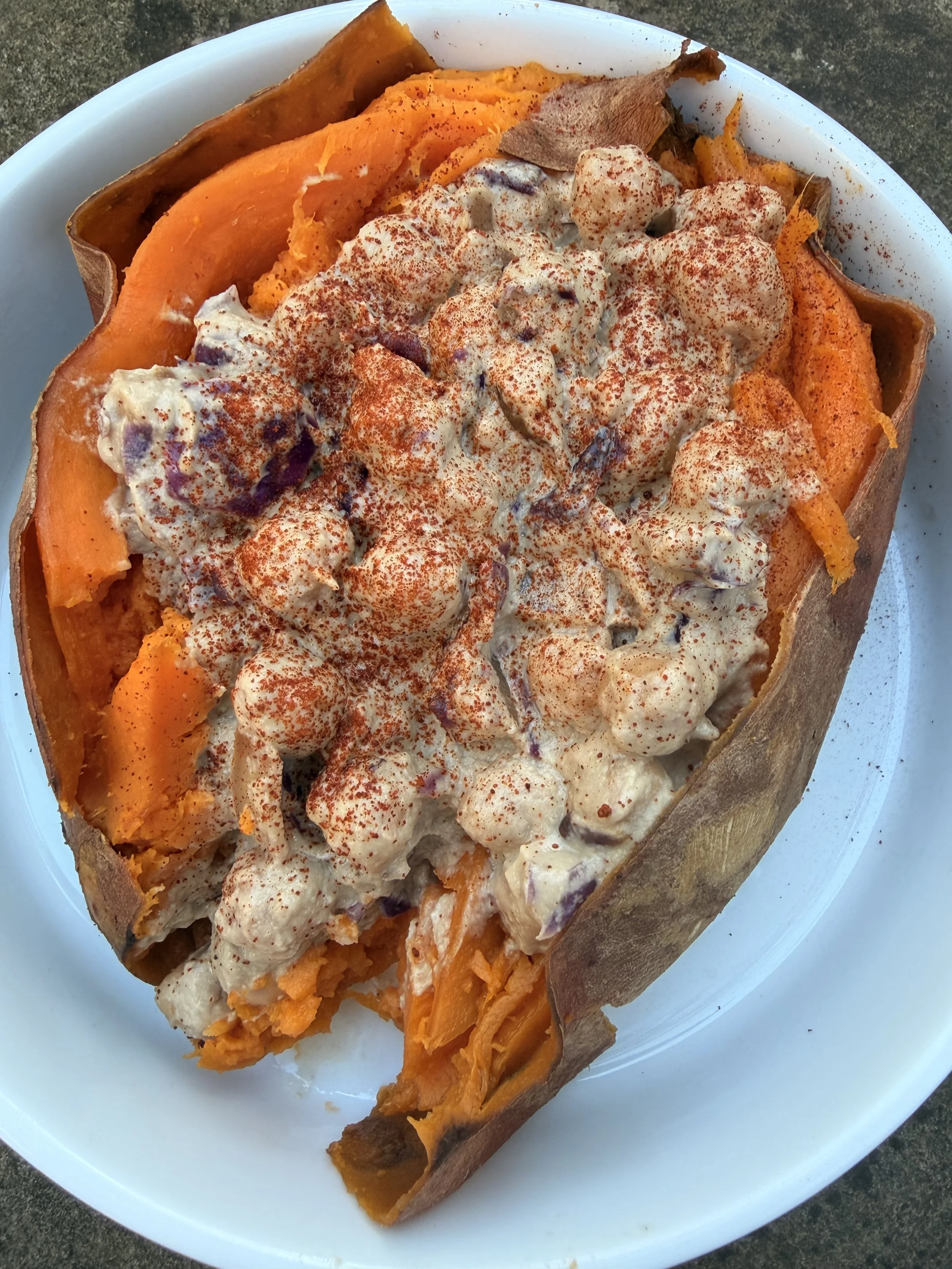 Once cool enough to handle, slice open and scoop/mash the insides with vegan butter, salt, and pepper. Keep warm.