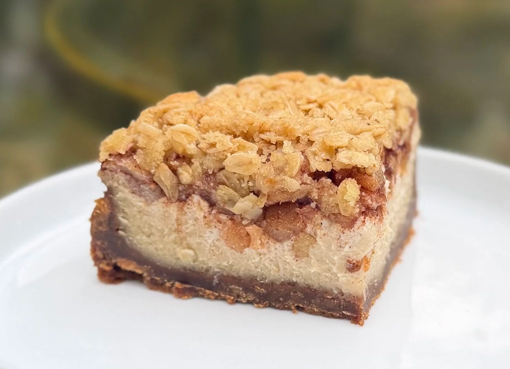 The best part? Each layer brings its own texture and personality. The graham crust adds a crisp base, the cashew cheesecake layer is smooth and luscious, and the topping — a combination of tender caramelized apples and cinnamon oat crumble — offers the perfect contrast of warmth and crunch. It’s like apple pie and cheesecake came together for a beautiful vegan celebration.