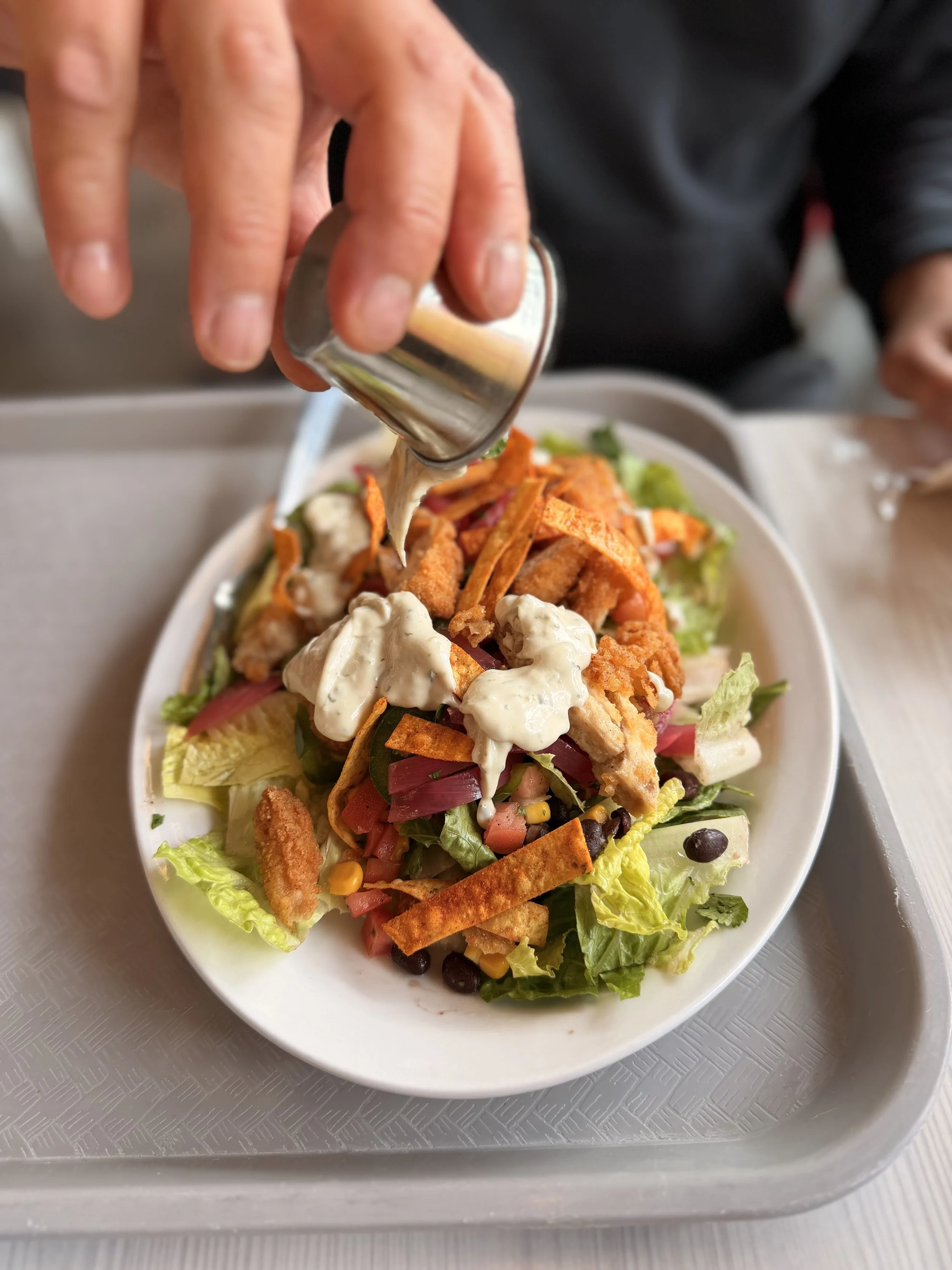 Roasted corn salsa added a smoky sweetness, while black beans brought depth and heartiness. Pickled red onions and jalapeños cut through the richness with sharp, tangy notes, offering contrast and balance. Tortilla strips added crunch, echoing the fried tenders while introducing a subtle corn flavor that tied everything together.