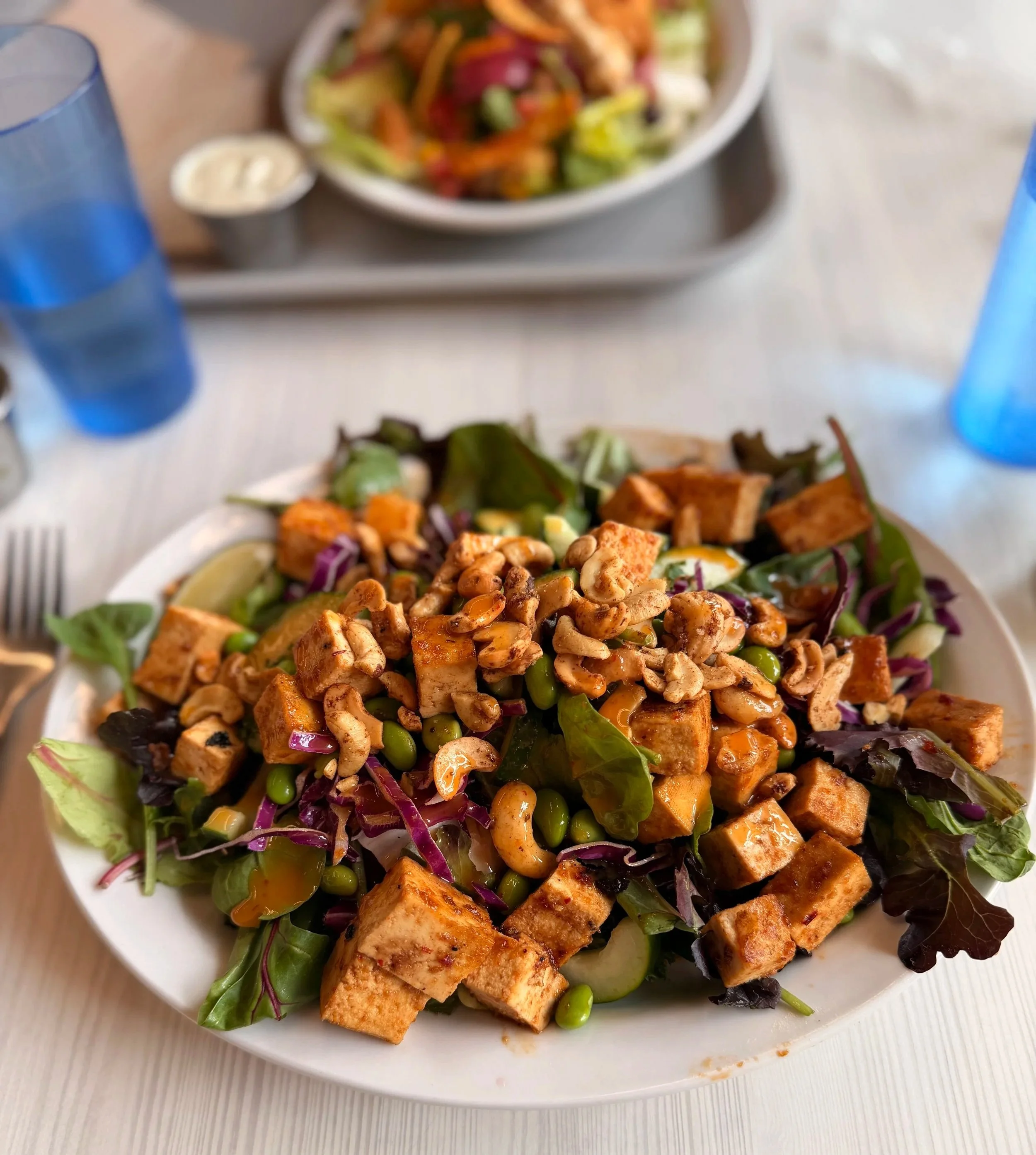 As the Thai Tofu Salad came to our table, it immediately set the tone. Vibrant and abundant, it looked like a celebration of color—deep reds, fresh greens, bright pops of cilantro and cabbage layered beneath perfectly prepared tofu.