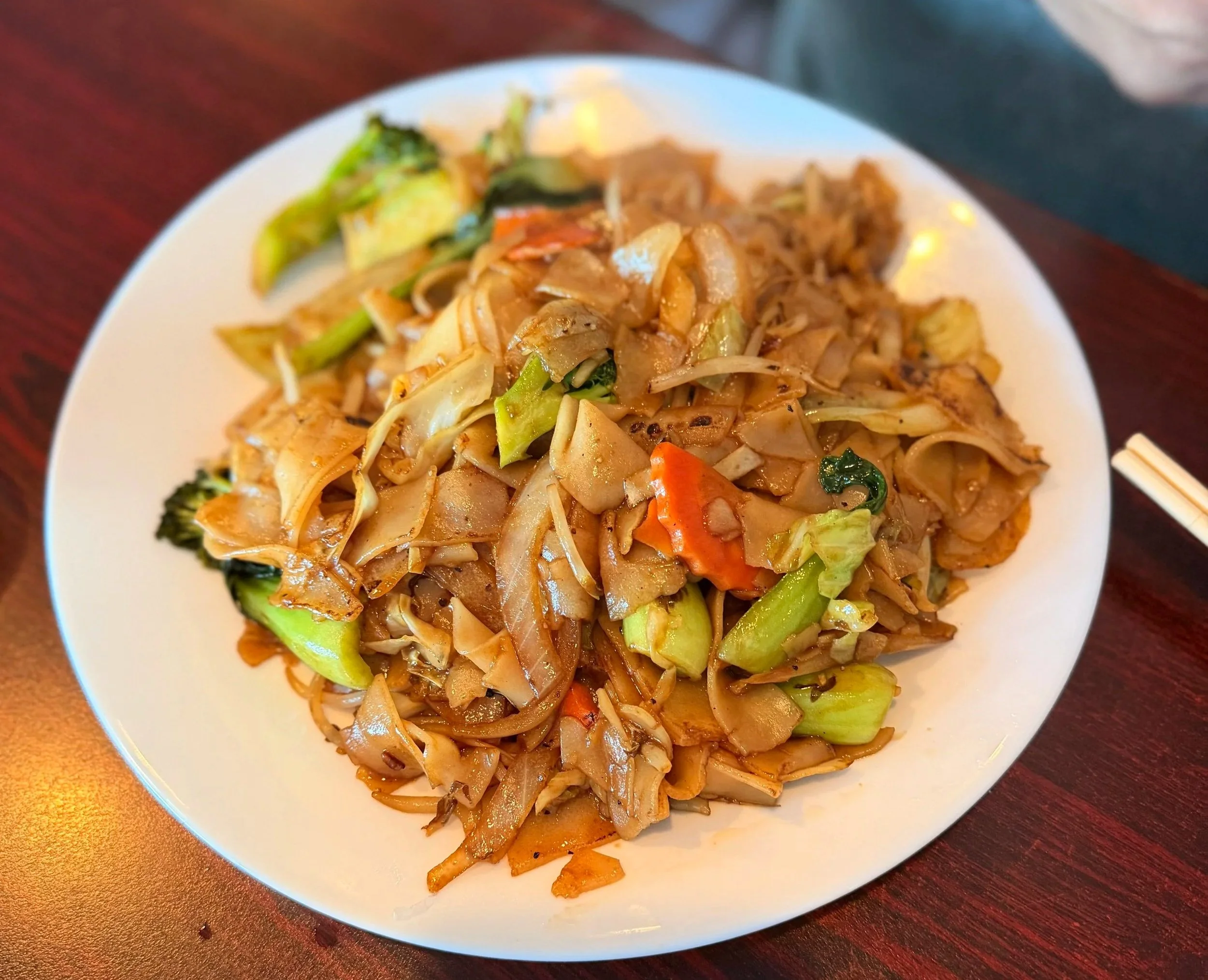 The vegan Phở Xào arrives steaming, glossy with a savory brown sauce that clings to every ribbon of tender chow fun noodles. Each bite is a perfect balance of texture—silky noodles tangled with crisp-tender bok choy, broccoli, and bean sprouts. Sweet onions melt into the dish, while fresh basil adds a fragrant lift that keeps it bright and aromatic. The sauce is rich yet not heavy, coating everything with deep umami flavor. It’s comforting and satisfying, the kind of dish you settle into, savoring slow bites as the warmth and flavors build with every forkful.