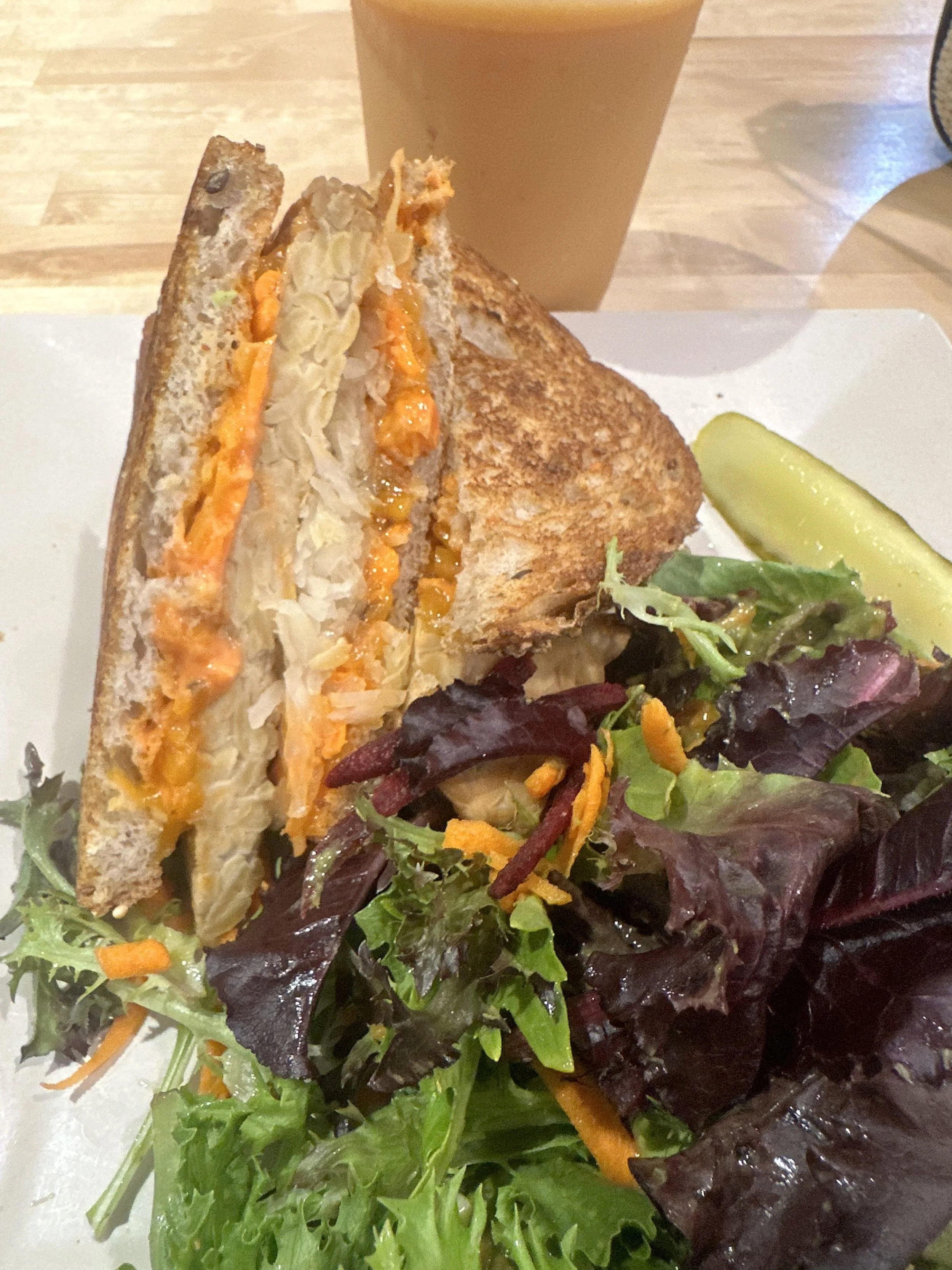 Tempeh Reuben — Provision’s delicious, plant-based twist on the classic deli sandwich. The marinated tempeh had a rich, savory flavor that paired beautifully with the tangy sauerkraut and sweet crunch of the carrots. Melted soy cheese added a creamy texture, while the non-dairy Russian dressing tied everything together with its perfect balance of zippy and slightly sweet notes. Served warm on perfectly grilled multigrain bread, the sandwich had great texture — crisp on the outside and hearty within. The accompanying salad was a light, fresh contrast to the richness of the sandwich, making the meal feel balanced and satisfying. Altogether, it was a comforting, nostalgic bite that didn’t feel heavy or overly indulgent. This is exactly the kind of vegan sandwich we love to seek out in the Hamptons— inventive yet familiar, packed with flavor, and leaving us happily full but never weighed down.