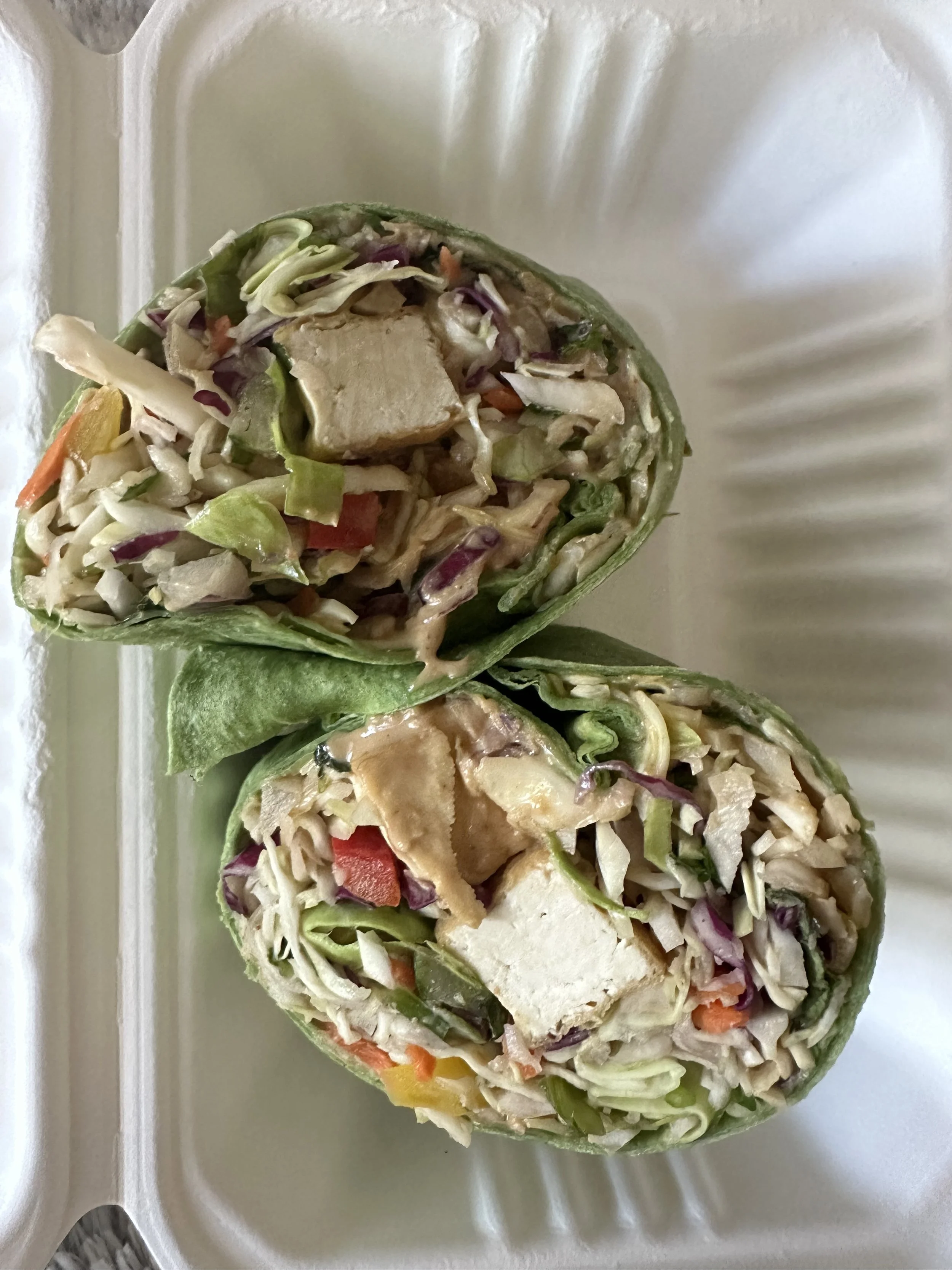 The Thai Wrap with tofu is a fresh, flavorful bite that perfectly balances crunch and creaminess. Wrapped in a vibrant spinach tortilla, the savory tofu pairs beautifully with crisp Thai cabbage slaw, offering layers of texture and a hint of refreshing zest. The spicy peanut sauce ties everything together, adding a rich, nutty kick with just the right amount of heat. Light yet satisfying, it’s a wholesome wrap that feels both nourishing and indulgent in every bite.