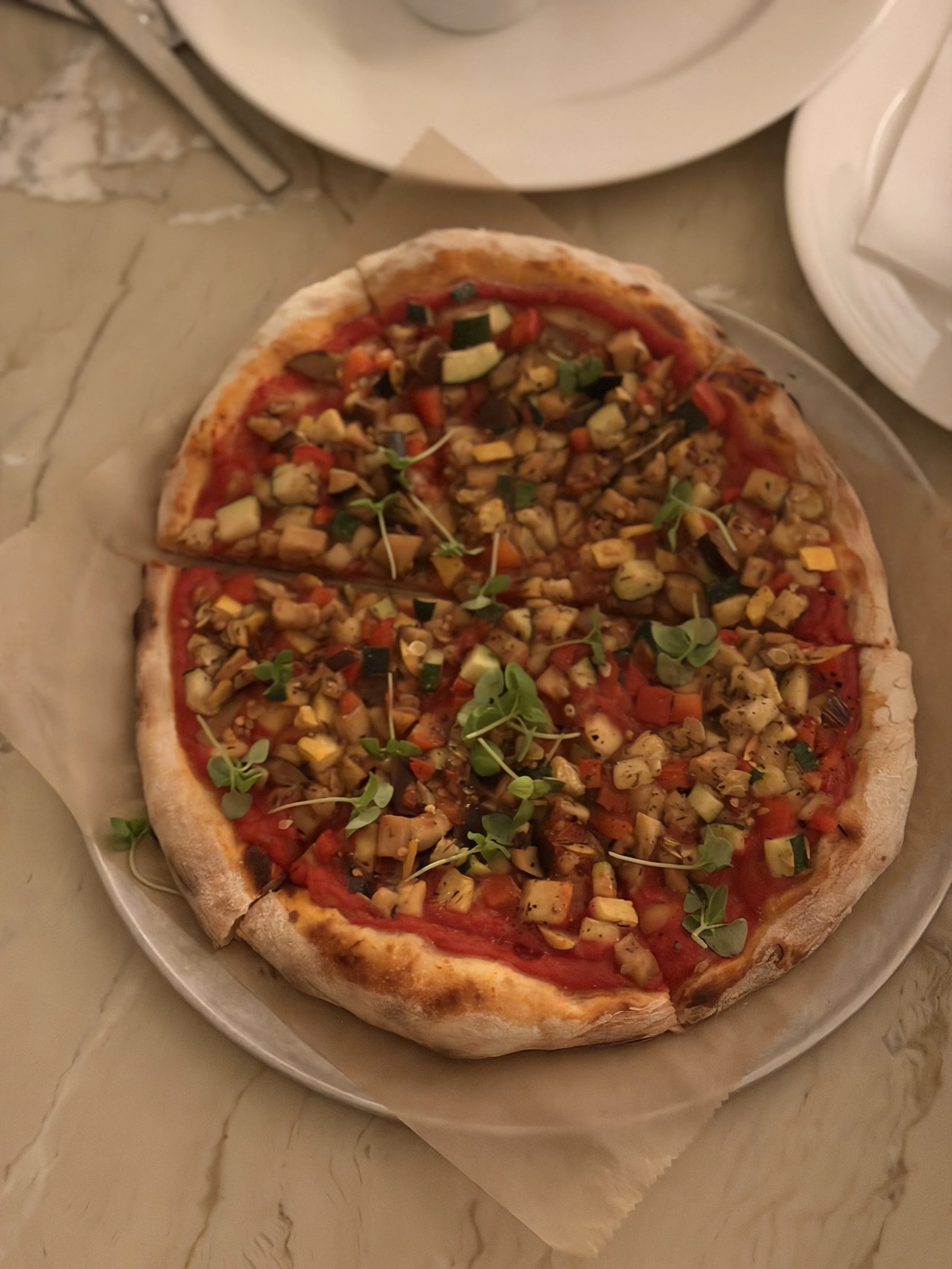 The Vegetable and Crushed Tomato pizza was vibrant, rustic, and deeply satisfying. A crisp yet chewy crust set the stage for a bright, slow-simmered tomato base that tasted fresh and balanced. Tender roasted eggplant and zucchini added richness and body, while fragrant basil brought a pop of herbaceous freshness. A gentle sprinkle of chili flakes delivered just enough heat to keep each bite lively without overpowering the vegetables. Simple, honest, and full of flavor, this pizza showcased how plant-forward cooking can feel both comforting and elevated—perfect for sharing as the evening eased us into vacation mode.