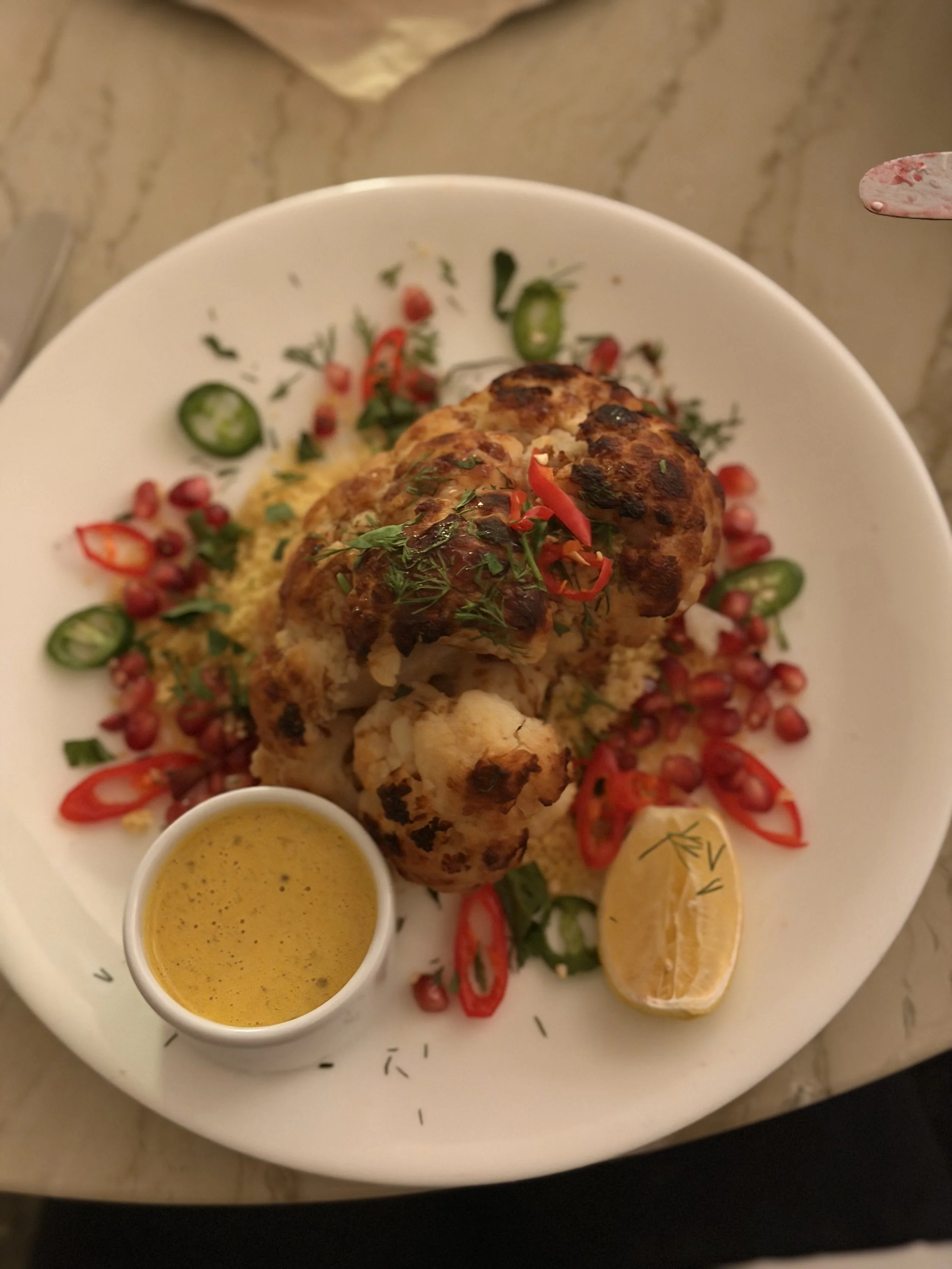 The roasted cauliflower was the kind of dish that quietly steals the spotlight. Perfectly tender with caramelized edges, it carried a warm, earthy depth that paired beautifully with the golden turmeric tahini. The sauce was silky and aromatic, adding both richness and brightness without overwhelming the vegetable itself. Nestled alongside fluffy couscous, the dish felt balanced and satisfying—comforting yet refined. Each bite offered a thoughtful mix of texture and spice, proving that simple ingredients, when treated with care, can feel indulgent. It was a standout vegan plate that felt right at home in a celebratory, travel-ready meal.
