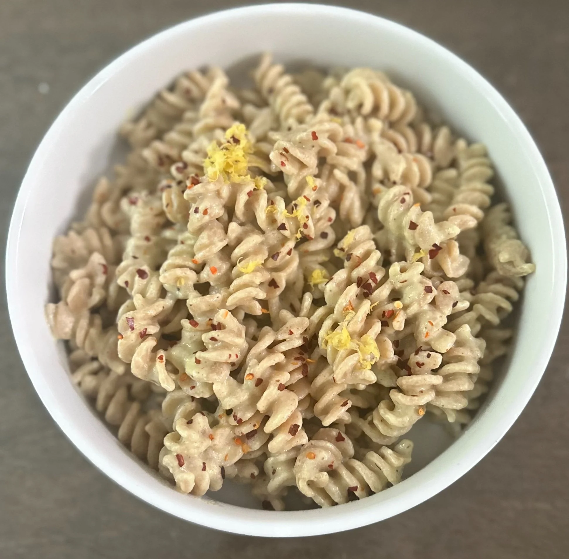 This pasta dish is rich in vitamins and minerals like magnesium, potassium, B vitamins, and vitamin C. Lemon juice provides a dose of vitamin C, which enhances iron absorption and supports skin health and immune function. Avocados and nuts contribute magnesium—a mineral crucial for muscle and nerve function, energy production, and bone health.
