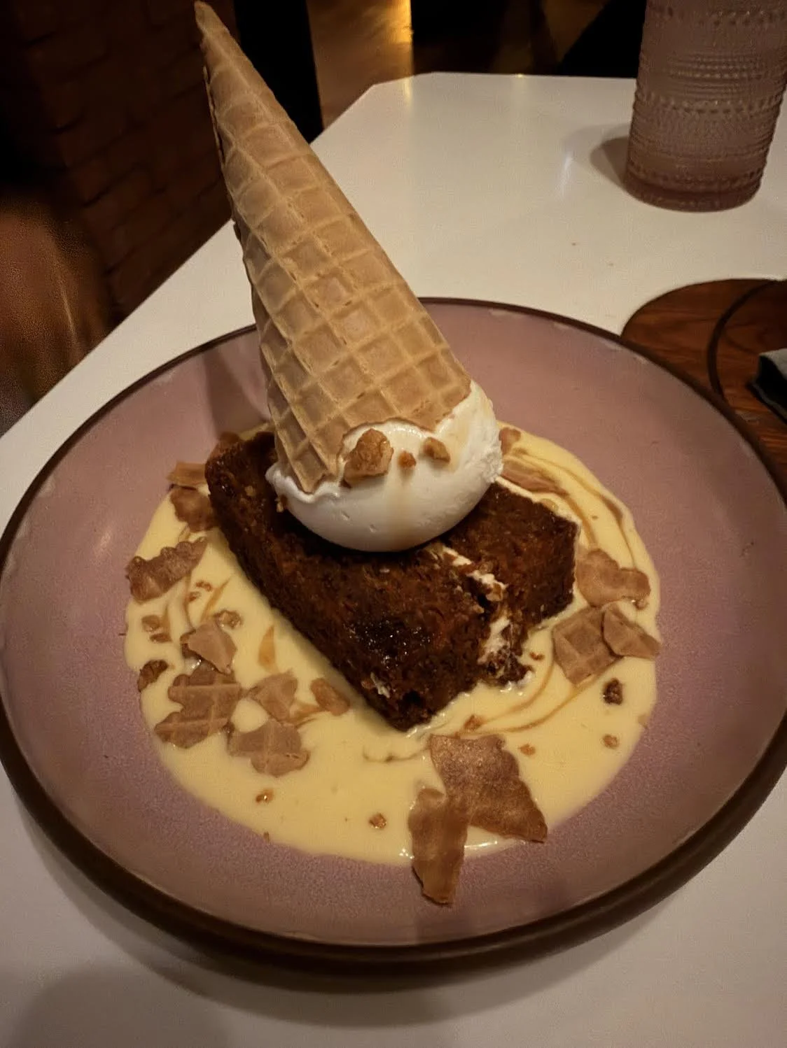The vegan carrot olive oil cake was the perfect ending to the meal—thoughtfully balanced, beautifully spiced, and utterly satisfying without feeling heavy. The cake itself was incredibly moist, with warm spices that added depth and a subtle complexity rather than overwhelming sweetness. The olive oil gave it a delicate richness, while the tahini maple frosting brought a nutty, lightly sweet creaminess that complemented the cake perfectly. A sprinkle of walnut brittle added just the right amount of crunch, creating a lovely contrast in texture. Paired with a scoop of silky vanilla ice cream, the dessert felt indulgent yet refreshingly light, leaving you content rather than weighed down. It was a refined take on a classic, showcasing how vegan desserts can be just as nuanced and satisfying—if not more so—than their traditional counterparts.