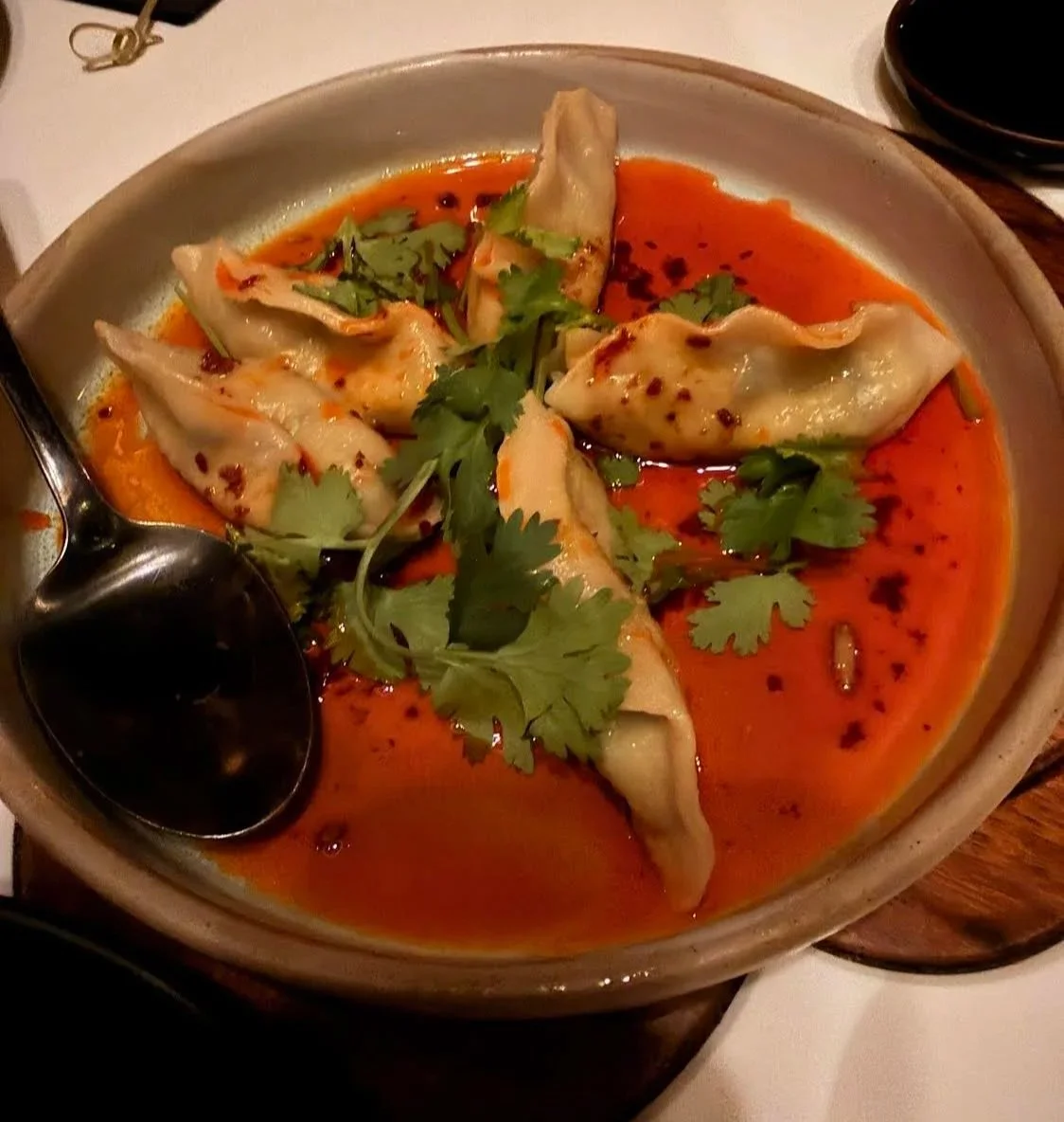 There's something deeply satisfying about biting into a steamed edamame dumpling—the delicate, slightly translucent wrapper giving way to a vibrant green filling with a gentle, grassy sweetness. The edamame lends a subtle nuttiness and creamy texture that feels lighter than traditional pork or shrimp fillings, making each piece feel almost virtuous. The real magic happens with the dipping sauce. A slick of chili oil—its slow burn building with each bite—meets the sharp, tangy complexity of black vinegar, creating a sauce that's simultaneously fiery, sour, and faintly sweet. Drag a dumpling through that glossy pool, and suddenly you have heat, acid, and umami in perfect balance. Simple, elegant, and impossible to eat just one.