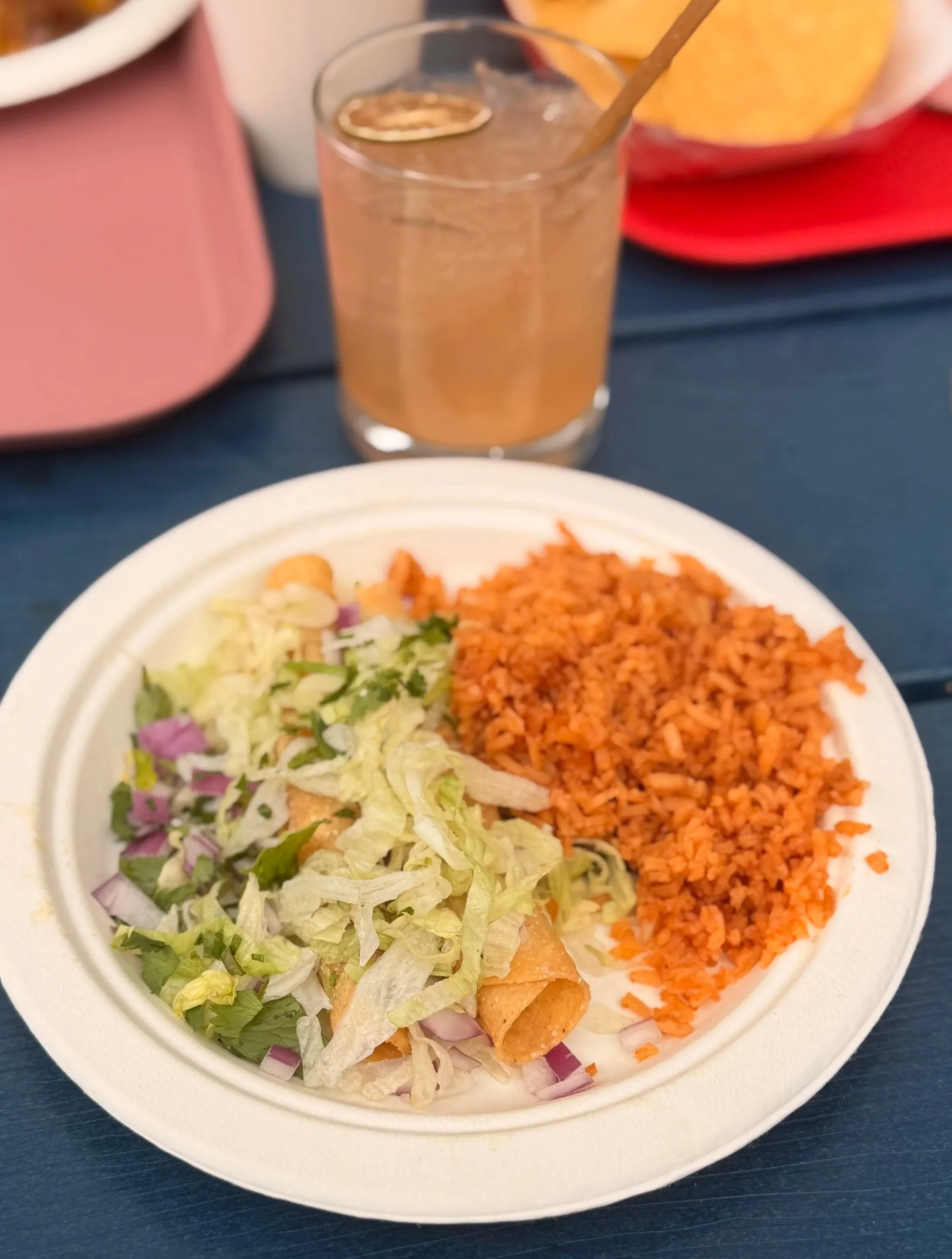 I ordered the vegan Rollies, which are rolled taco shells stuffed with potato, topped with lettuce and cilantro. They came with a side of rice, and I added a mezcal paloma because, honestly, it felt like the only correct choice for a Tucson evening.